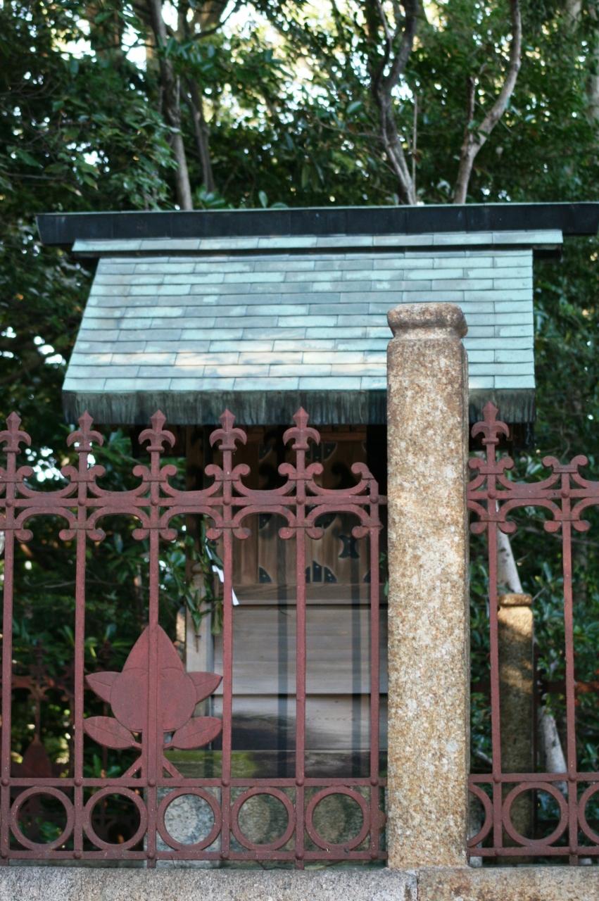 金属製の頑丈な柵で囲ってあった末社らしい建物の光景です。城山八幡宮に祀られている八柱以外の御神体が祀られているようです。摂社(本社)、別社、末社などの名称は、現在では官国弊社に関する用語になり、府県郷村社の支配にかかる摂末社などは、境内神社・境外神社と呼ぶのが正しいようです。あまり一般的ではないようですから、末社などの呼び方のままにしておきます。