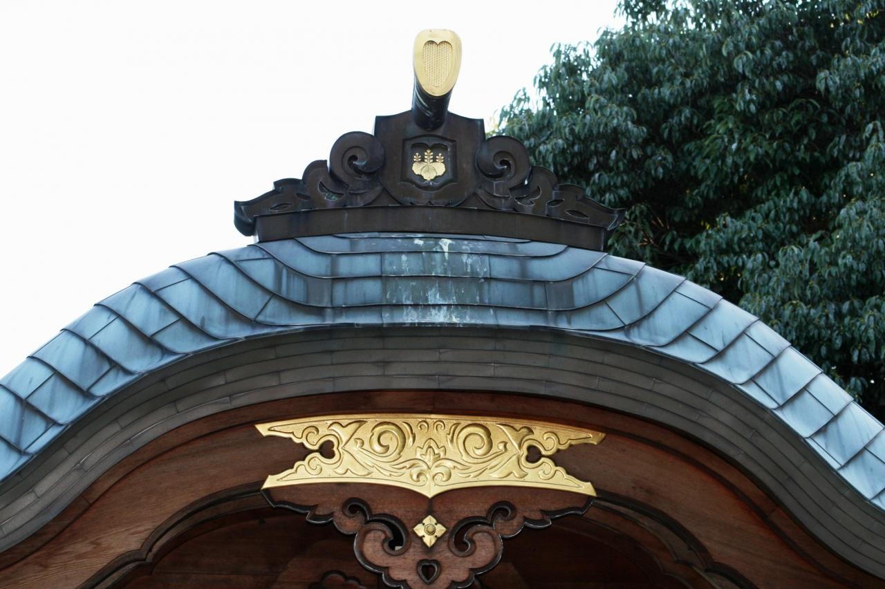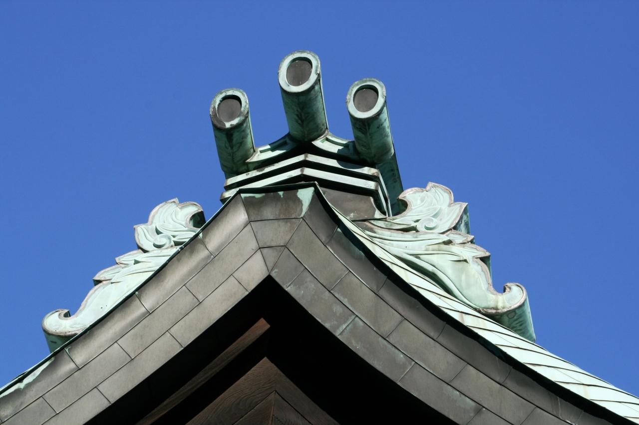 一度紹介済みですが、もう一度紹介する拝殿の唐風の屋根のズームアップ光景です。