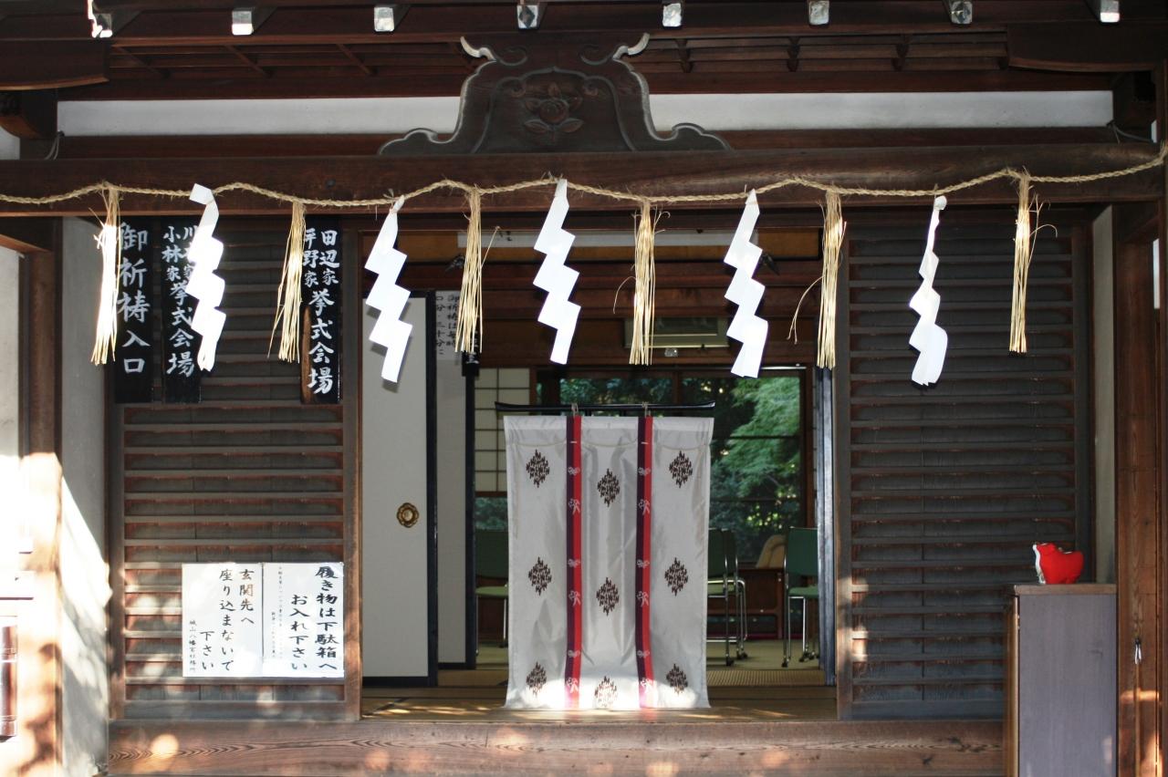 本殿の拝殿光景です。城山八幡宮の社殿は、本殿、祝詞殿、幣殿、拝殿、廻廊、神門等から構成されています。