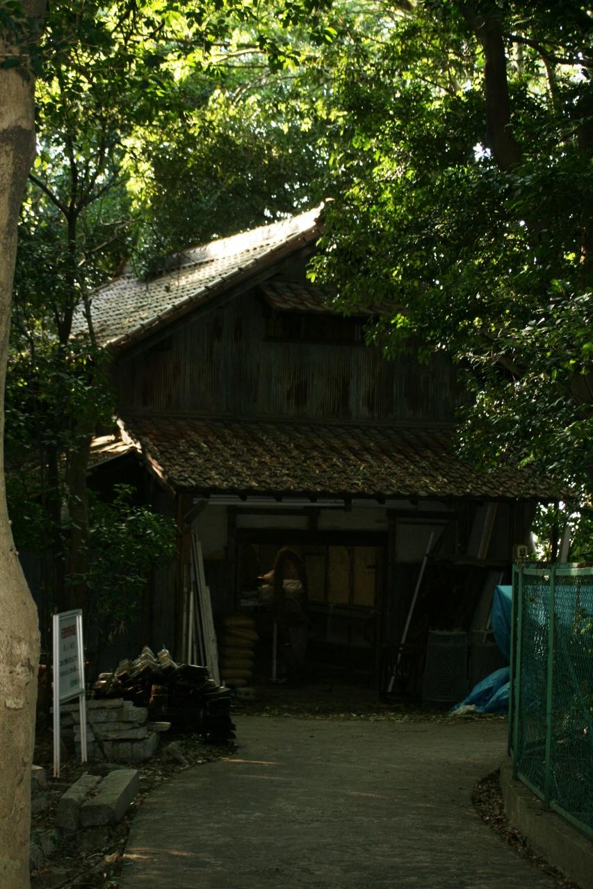 薄暗い木立の中にあった古い建物光景です。廃屋か、物置小屋として使われているような痛み方でした。