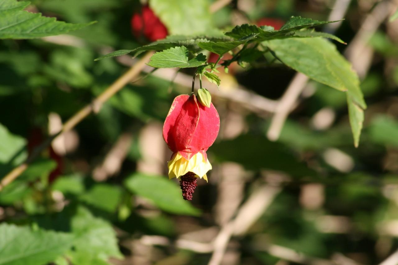 チロリアン・ランプの可愛らしい花の光景です。浮釣木(うきつりぼく)の和名を持つ、アオイ科の植物です。