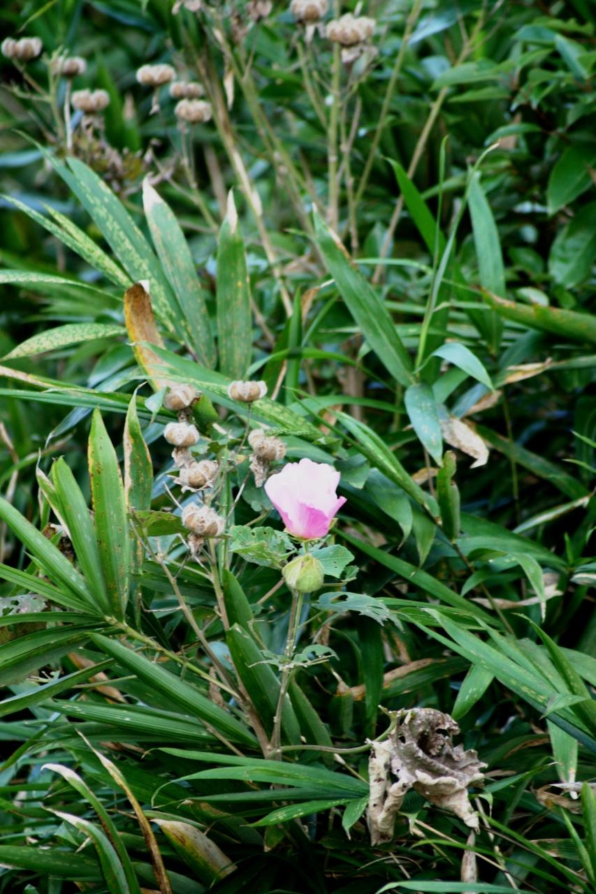 笹の間でピンクの華を咲かせていた芙蓉です。野生化しているようでした。竹に攻められ、虫に食われて大変そうでした。