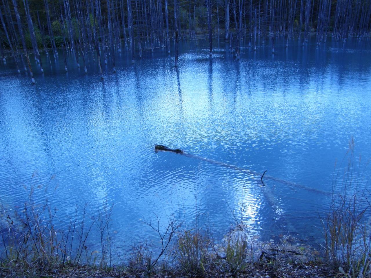 駐車場に車を停めて徒歩5分ぐらいで青い池は見えてきます。