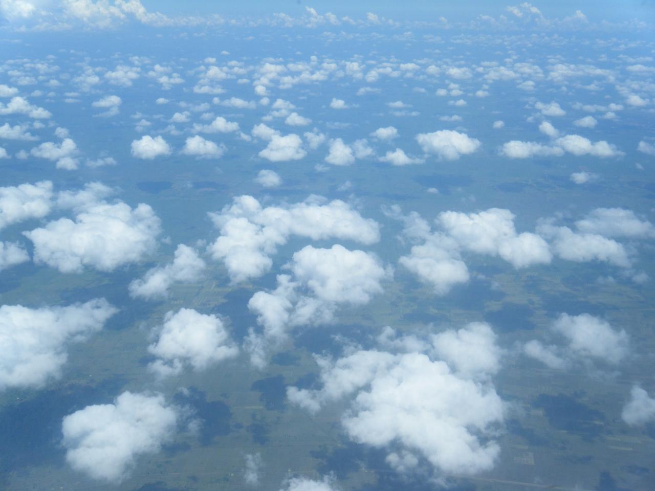 やっぱり雨季です。それには白い雲がプカプカ。カンボジアへ入ると、たくさんの水溜りが飛行機からでも確認できました。