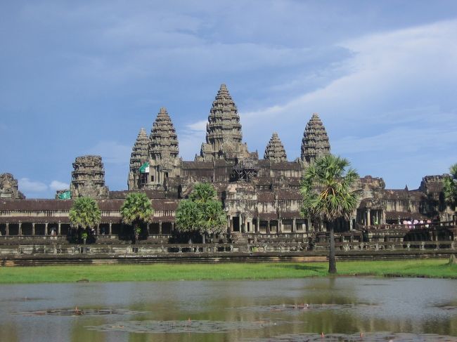 アンコール・ワットのアンコールとは「王都」、ワットとは「寺院」のことを示します。ヒンドゥー教の神であるヴィシュヌ神を祀る寺院、そして王の墳墓として建てられました。すべて石造りで、左右対称の巨大な寺院、はクメール建築の最高傑作といわれています。周囲は環濠に囲まれており、中には参道や回廊、中央塔、そして回廊の壁には緻密な壁画があります。