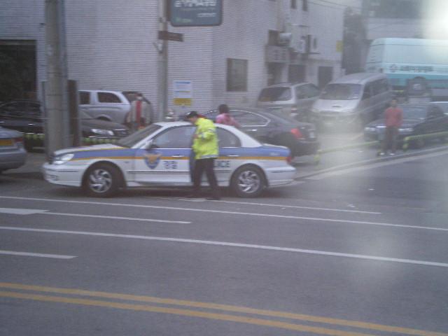 韓国のパトカーの写真です。日本は白黒ツートンですが、韓国は白青のツートンカラーです。