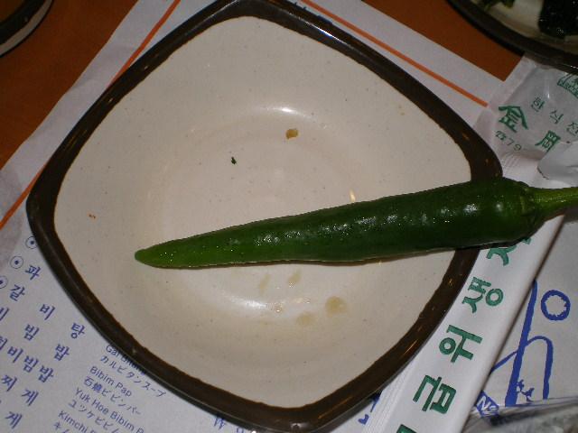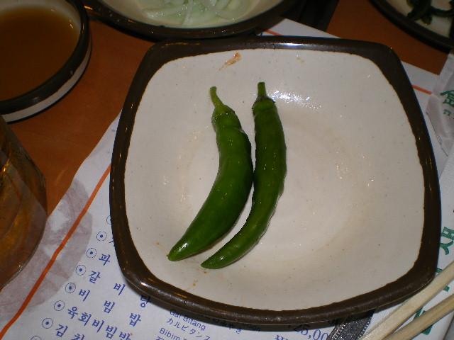 こちらの青唐辛子は先ほどのものとは違い1本目はそうでもないのですが、2本目へと食べ進むと後からだんだんと辛さが増してきて、口の中が火事にでもなったかのように熱くて熱くて堪りません。キンキンに冷えたビールで辛さを抑えました。