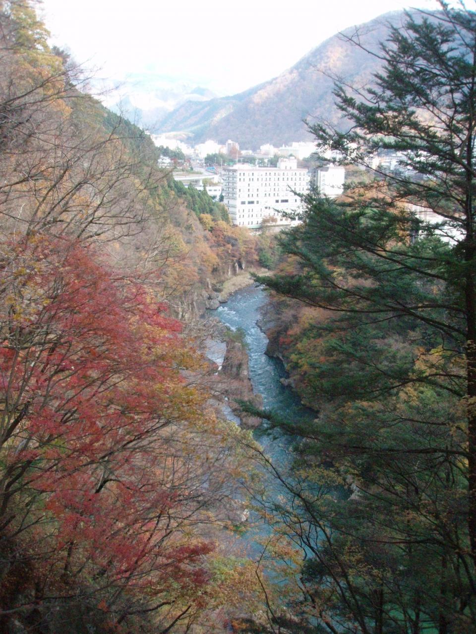 朝、温泉に入った後、浴衣姿で近くのくろばね橋を渡りました。そこから上流の鬼怒川温泉街を眺めた写真です。