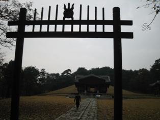 建物の裏にはこんもりした陵寝があり、その周りを囲み守るように動物や文官の石像が並んでおる。
