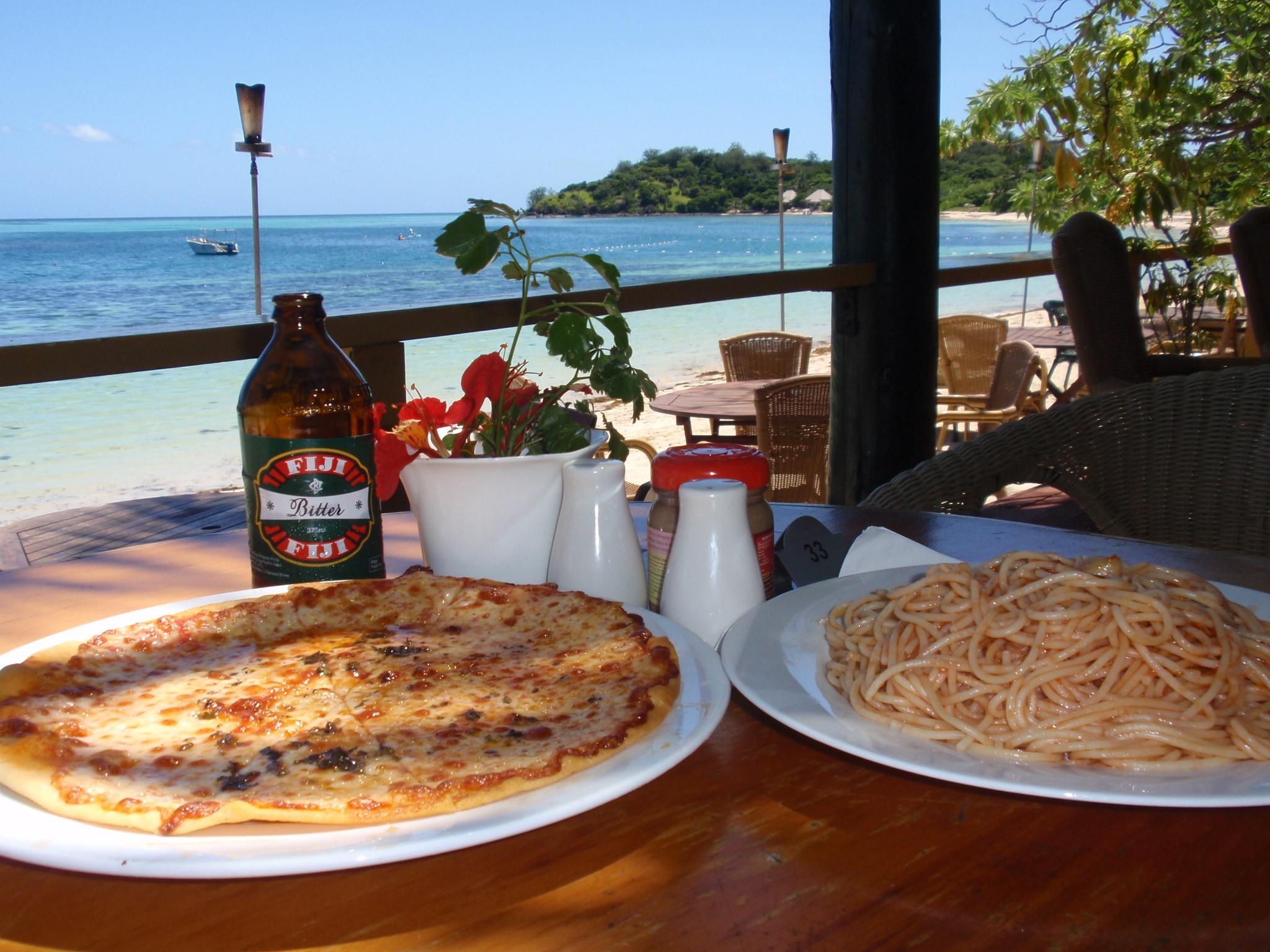 ピザマルゲリータ・トマトパスタ・ビール3本で50.5FJD。