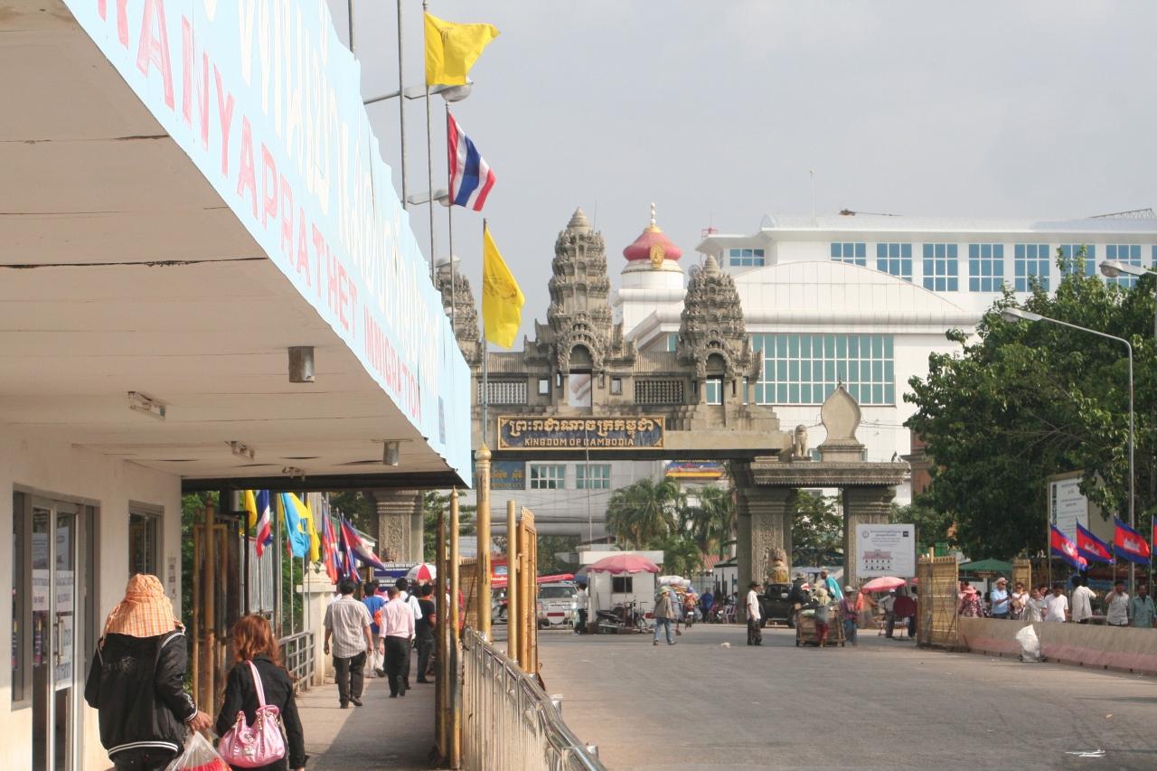 バンコクのカオサン通りからのツアーバスで4時間、12時半頃にアランヤプラテートのホテル兼旅行代理店へ到着。 昼食とビザの取得準備(ビザ取得は代理店が行う)、入国カードの記入。 1時間半後に別の車で国境まで行き、新たに別のグループが合流したり、日本人には日本語が話せるガイドが付いたりと離合集散。 出国と入国手続きに入った。 カンボジアのイミグレーションの入国窓口は3つで30分程度並んだ。 さらにバスでポイぺトのバスターミナルへ。 ドルを少し両替。 この間、ガイドの指示通りに動くしかないし、写真も取れず、まして全体のことはよく分からない。