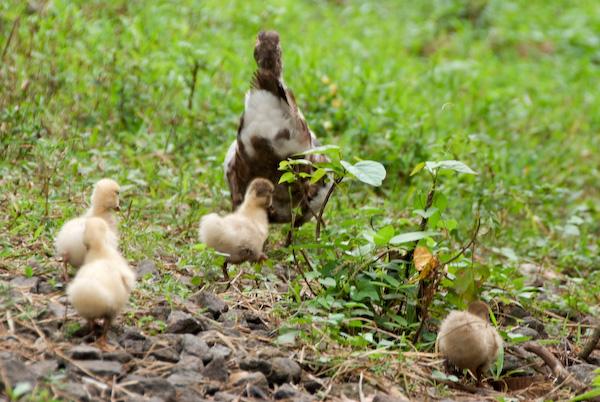 裏庭には、アヒルやニワトリが放し飼いにされています。