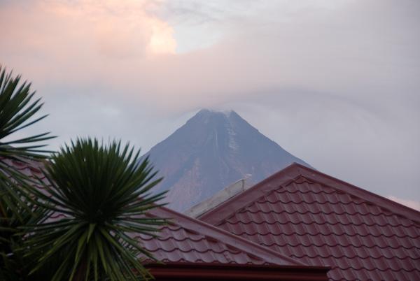 突然、7時頃に空が明るくなり火山が顔を出しました。慌ててカメラを取り出しホテル越しに撮影しました。 -