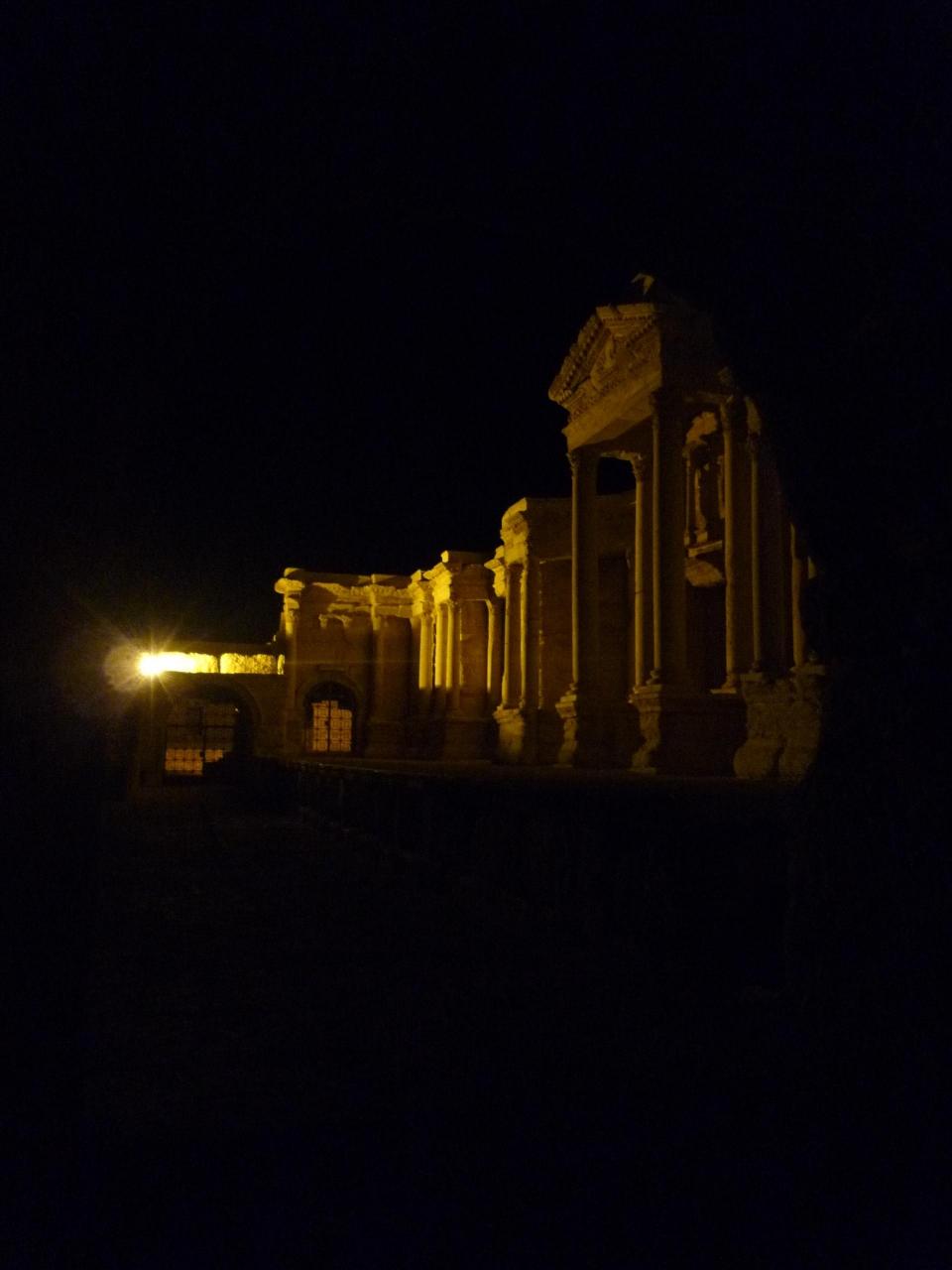ホテルから暗い道を歩いて10〜15分。パルミラ遺跡に着きました。やんわりしたライトアップでしたが、なかなかキレイです。人の気配がまったくないです…。時々、地元のメンズがバイクでぐるぐるやってきます。