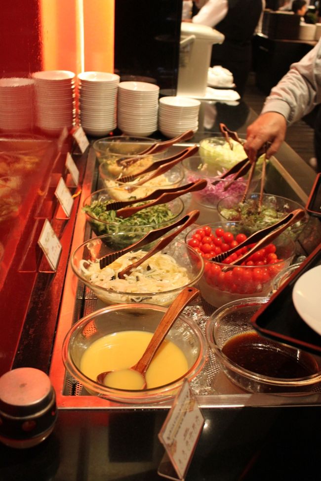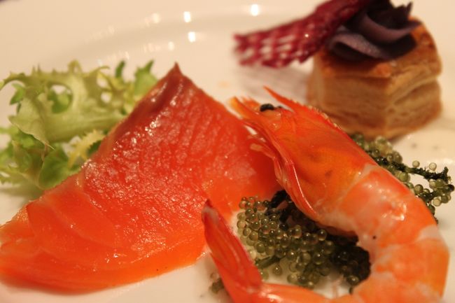 プールサイドでショーがあるとのことでしたが、最後の夜は全員でということになったのでレストランオーガスタの個室スペースでの食事になりました。みんなで乾杯。沖縄素材をベースにしたイタリアンかトレンドコースを選びます。私はトレンドでお魚を選びました。サラダがバイキングだったので立ったついでにショーの様子も見ることができました。