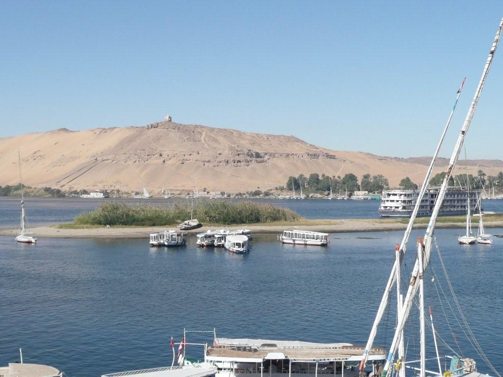 アスワン東岸から見た「風の丘」と呼ばれる西岸の丘。ここに「貴族の墳墓群」が数多く残されている。ここに渉るにはファルーカに乗るか、あるいはモーターボートに運んでもらう。