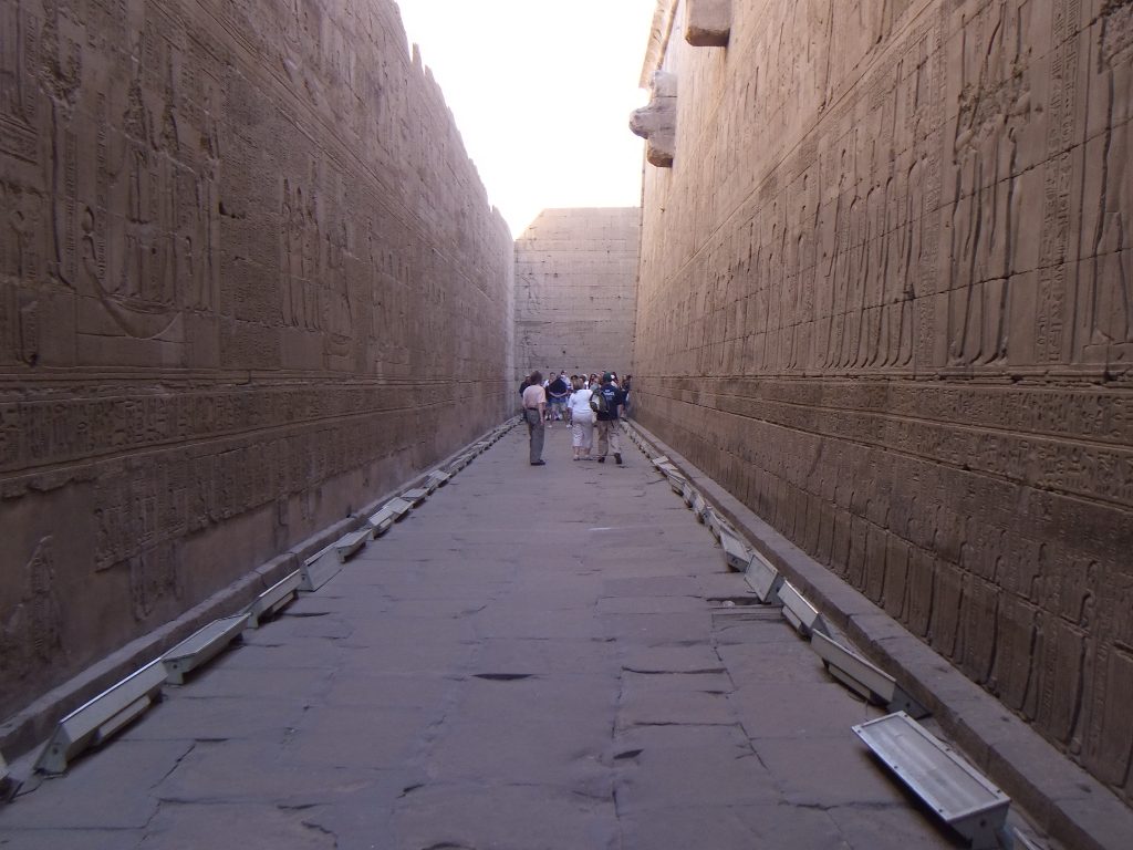 最後に、第二列柱室(他の部屋かも)あたりまで戻って、至聖所に向かって左側の通路を抜けていくと、中央通路と平行なこのような通路に出ます。この写真は至聖所と同じ方向を向いていて、右側に見えている壁は列柱室や至聖所などがある神殿のメインの建物で、左側に見えているのは、神殿の左側の外壁です。この左側の外壁に、ホルスがおじのセトを退治する様子が描かれています。セトは、兄のオシリスが王になったのが気に食わなくて(セトの奥さんと浮気をしたという話もあります)オシリスを殺害してしまいます。オシリスの子ホルスは、父親の敵討ちをするのです。敵討ちの様子は物語になっていて、ガイドさんによれば、向こう側が始まりでこちら側が終わりだそうです。どれも似たようなレリーフですが、向こう側から順に見ていくと、
