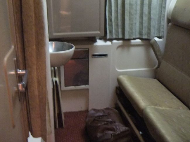 部屋に入ります。部屋はこんな感じです。とても狭いです。これでも2人部屋です(わたしは独り占めです。ちなみに左の扉は隣の部屋に行くためのもので通常鍵がかかっていて、向こう側には別の人たちがいます)。わたしは荷物1つなので問題ありませんが、スーツケースは開けるスペースがありませんので、着替えなどの必要なものをあらかじめ小さなかばんに入れておきます。それから、ナイルエクスプレスにはシャワーがありません。今夜はウエットティッシュなどで体を拭くだけです。