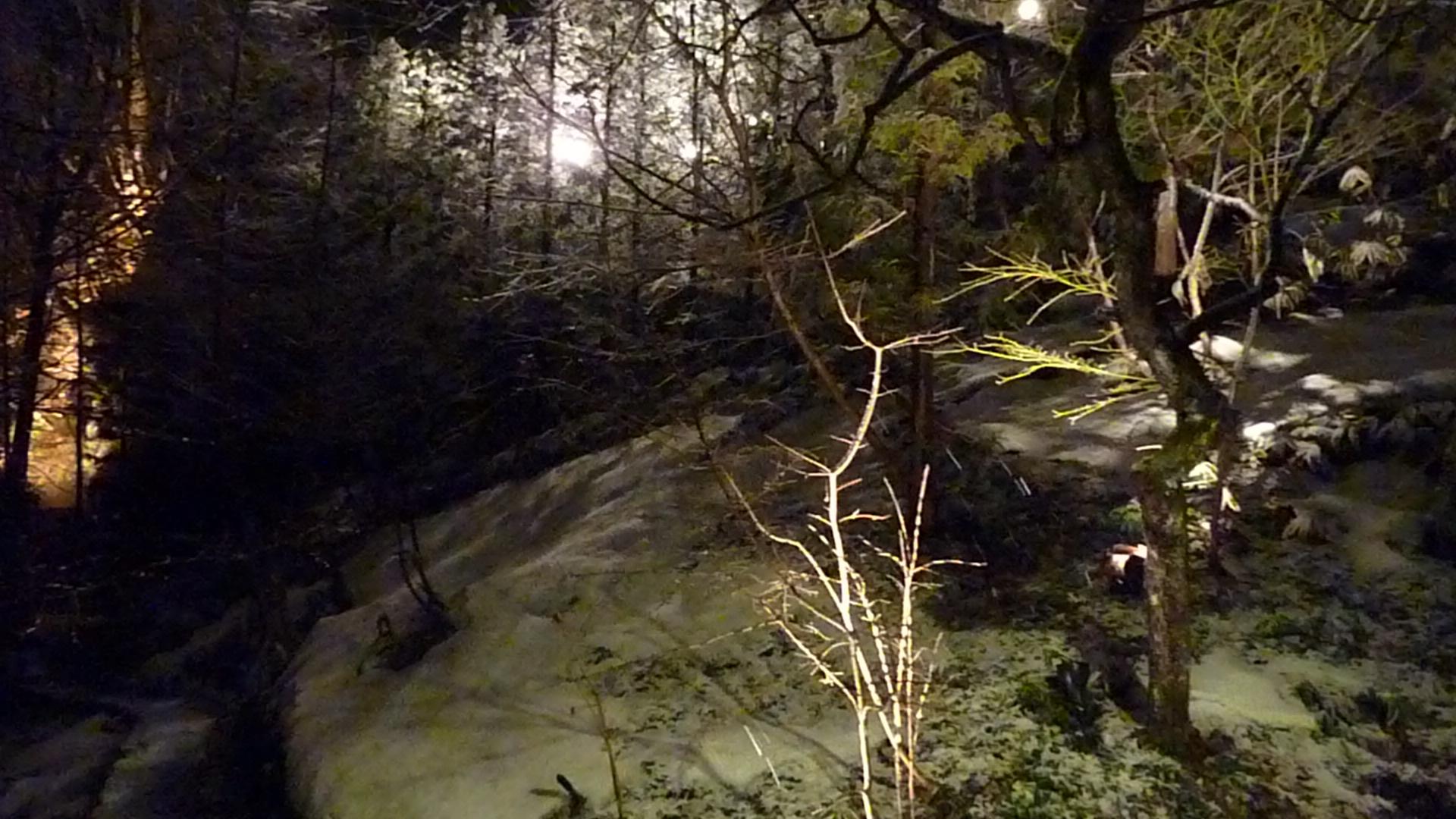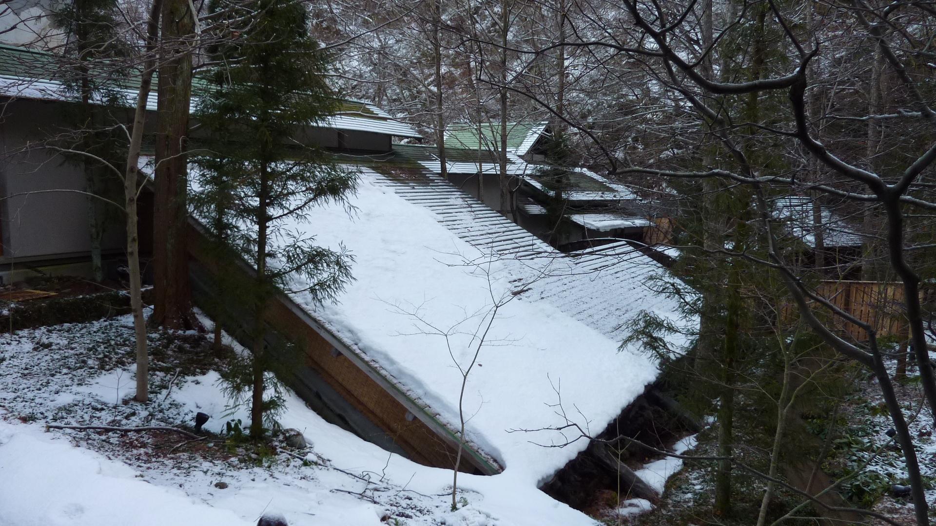 廊下の窓から見た旅館の中庭です。夕方からの雨が、夜になって雪になりました。