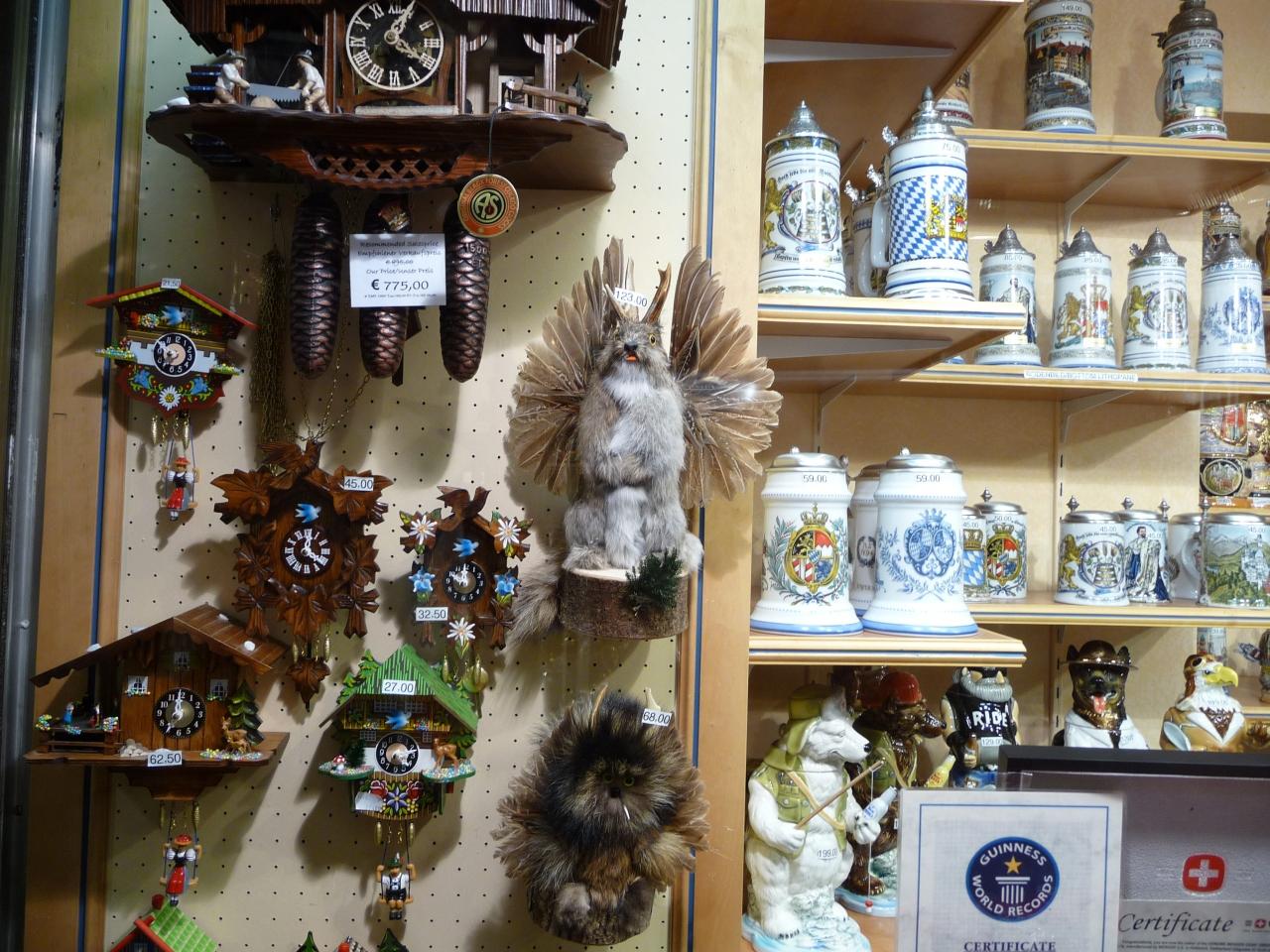 駅中のみやげ物屋のウインドウに、オクトーバーフェストで良く着る、女性の民族衣装の飾りビアジョッキ。