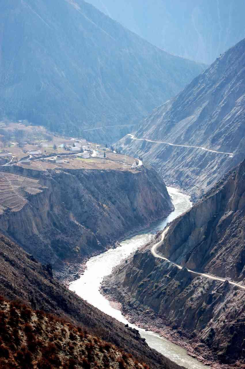 左の道の果てに橋があり、これを渡って瀾滄江(メコン川)の右の道を手前に進んで明永村に向かう。
