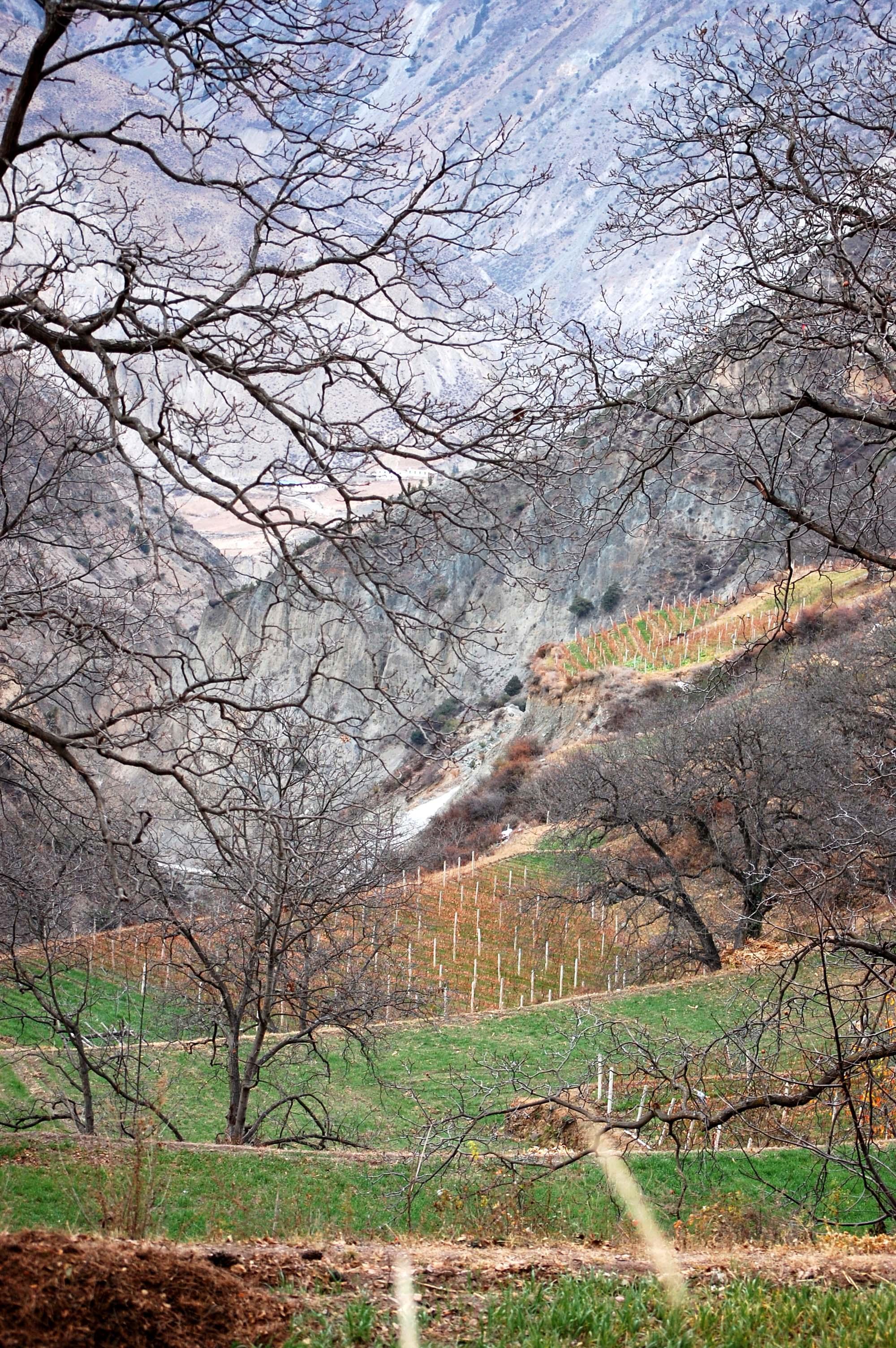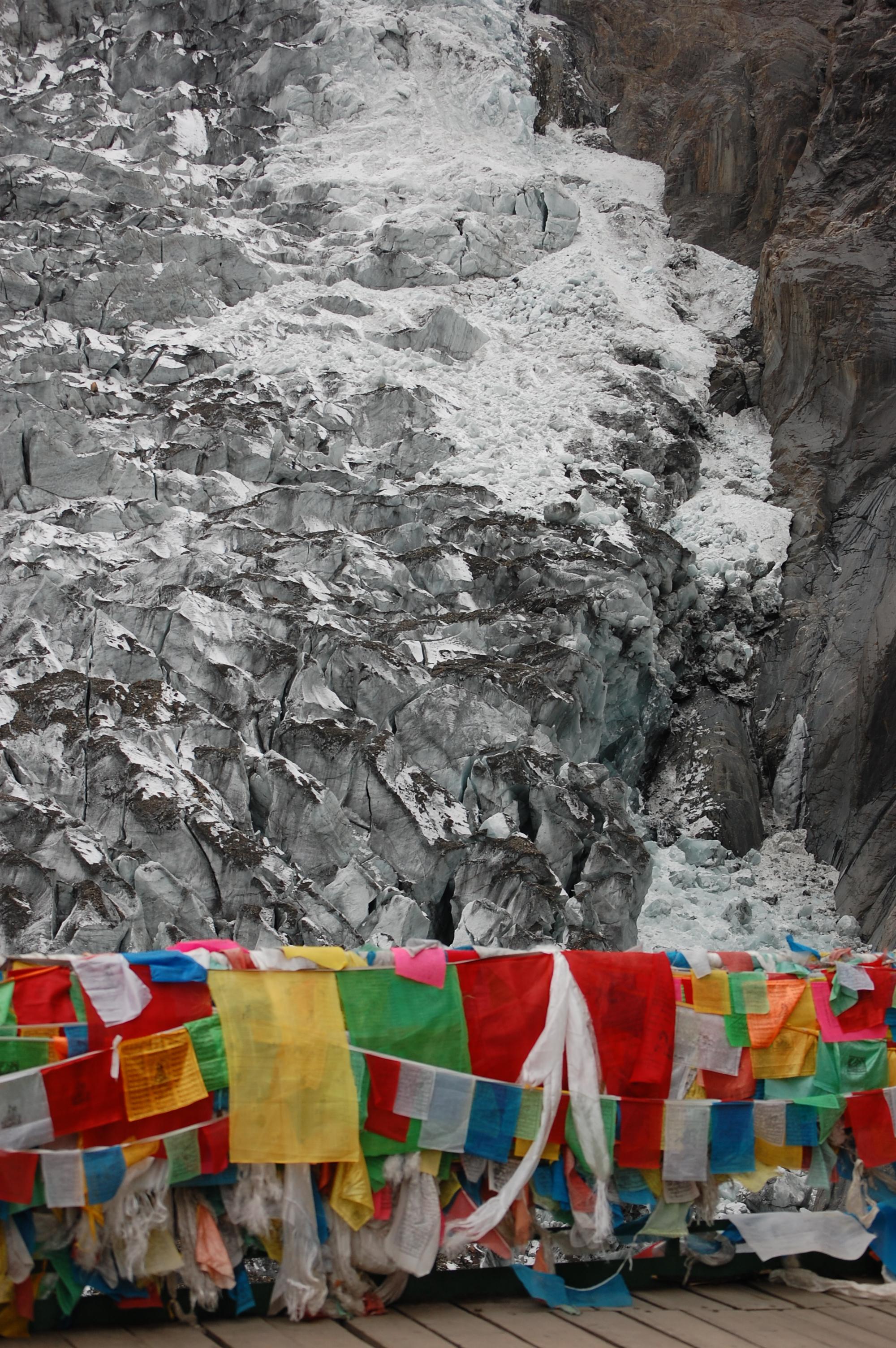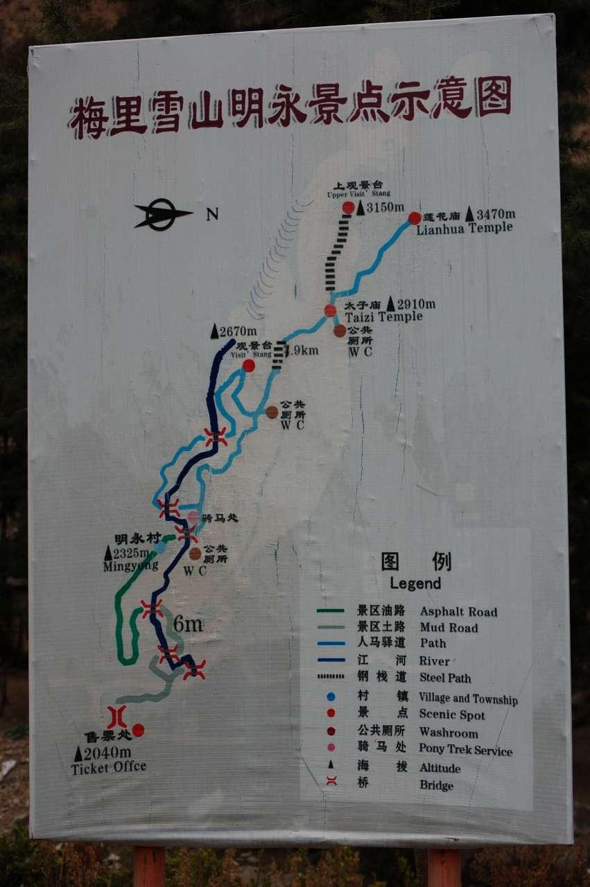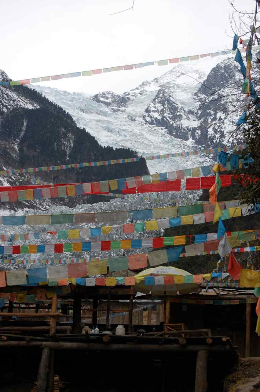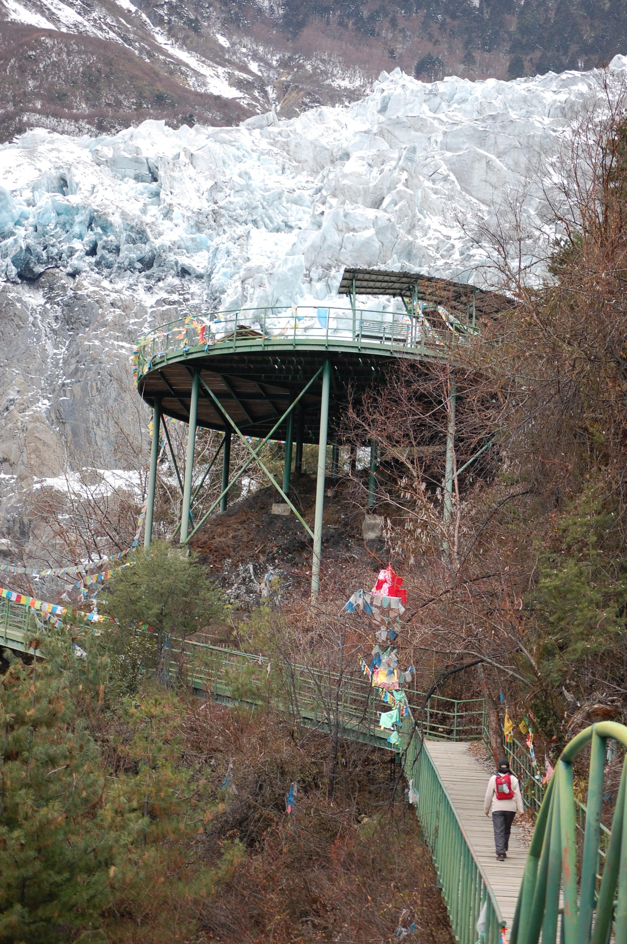 旅の6日目、2009年12月31日の11時、飛来寺の宿からタクシー(150元)で大氷河の麓の村「明永村」に向かった。村は深い谷間に位置し、瀾滄江(メコン川)の流れを眼下に見ながら、高度差1000mを一気に下った。右に断崖絶壁が続き、飛行機がランディングするようなスリリングな走行に、冷や汗が流れた。途中で入域料徴収のゲートがあり、保険料込みで83元を払った。