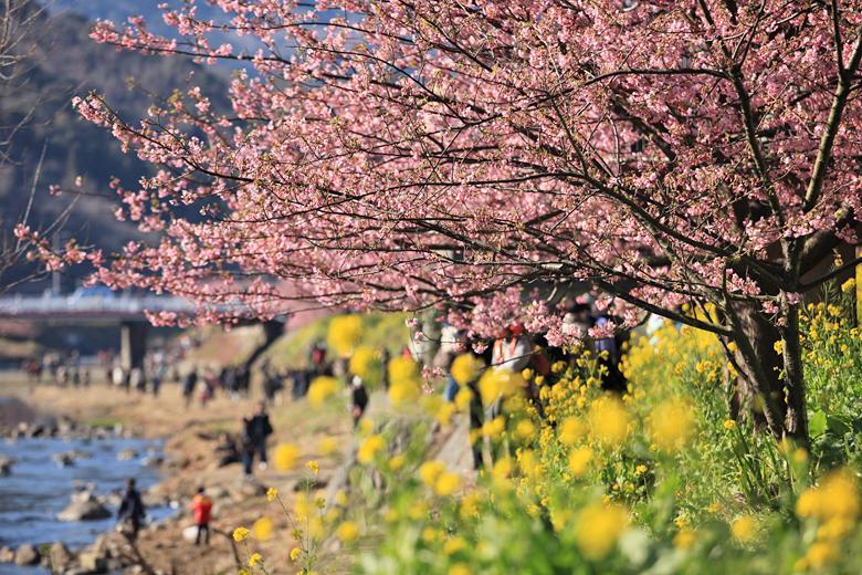 駅近くの河津川には菜の花も一緒に植えられています。