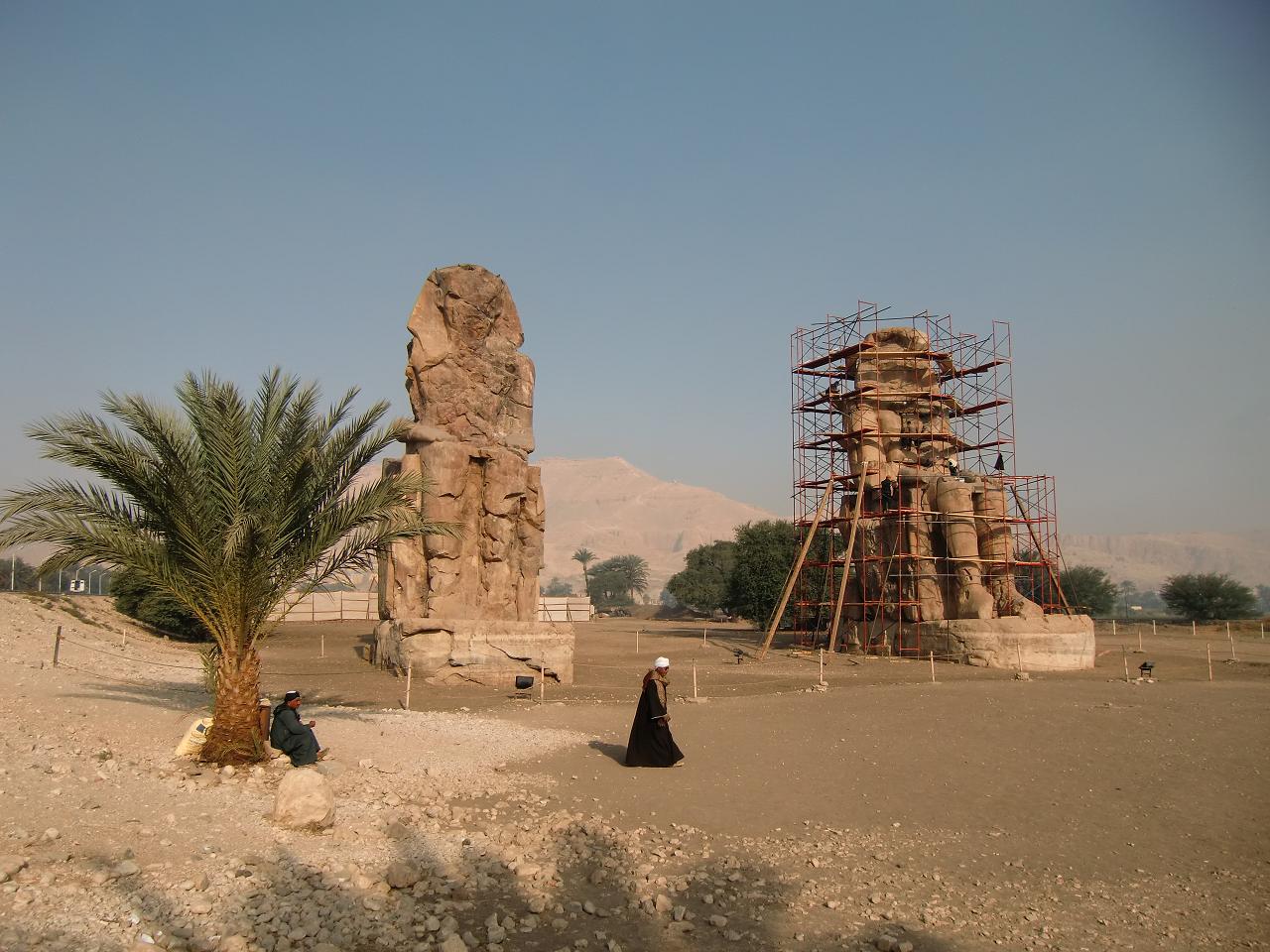 巨大な1対の座像「メムノンの巨像」(写真)と対面する。実に大きい。高さは20mもあり、砂岩の一塊りをブロックに切り取って作られている。