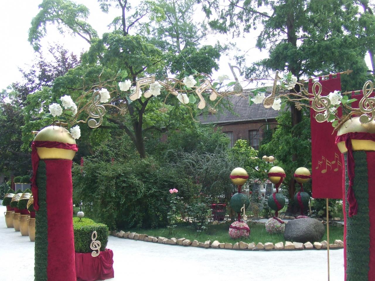 ト音記号や音符のアーチがあったり、庭園はバロック風?に飾られている。