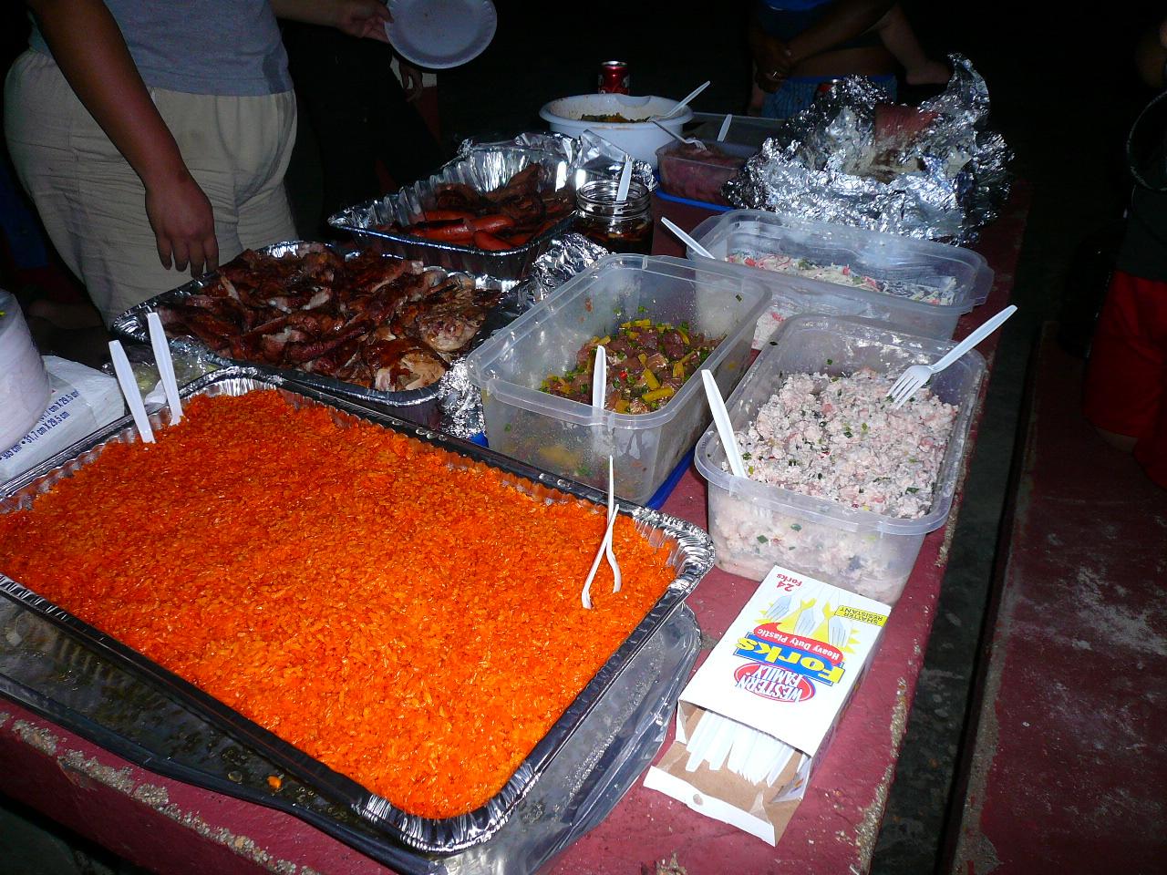 レッドライス(グアムの祝い事の時の家庭料理の定番)は、フードコートで食べるのと違い、ぜんぜん油っぽくなくて、ほんのりアチョーテの実の香りがして、ほんとにバカウマです)^o^( -