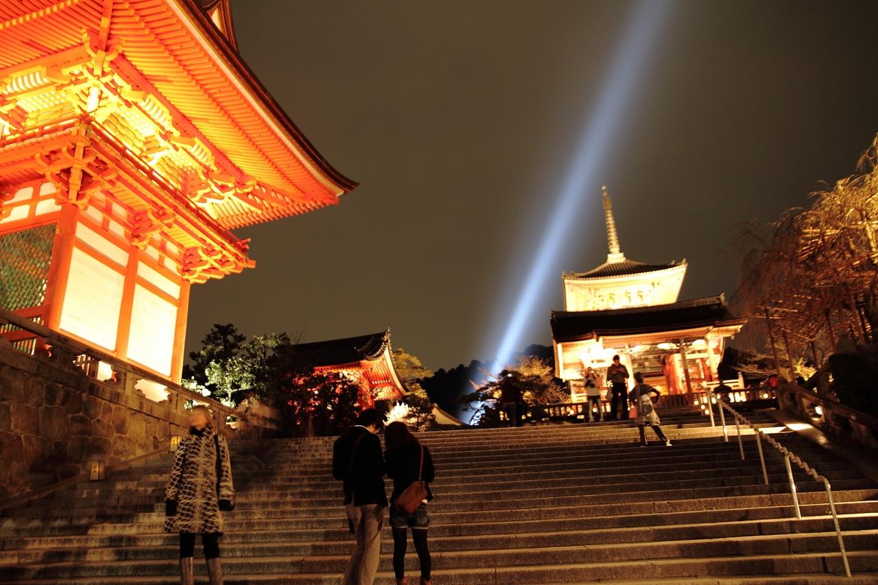 ライトアップされた清水寺。 -