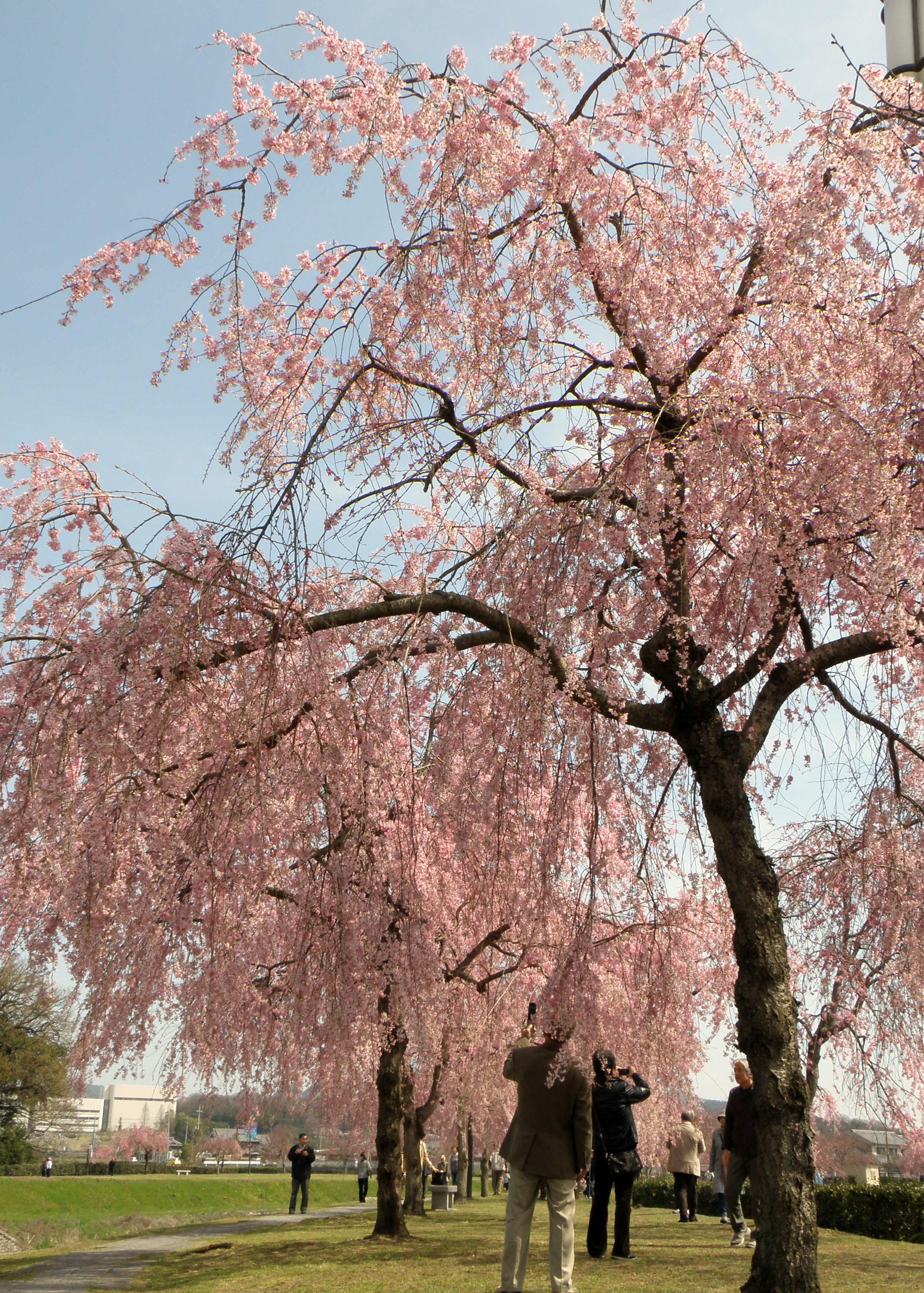 京都の桜守・佐野藤右衛門氏の指導を受けて大事に育てられた枝垂れ桜が、まだ蕾のものもあったが見頃の木もあり、ピンクが川面に映えてまさに春爛漫!