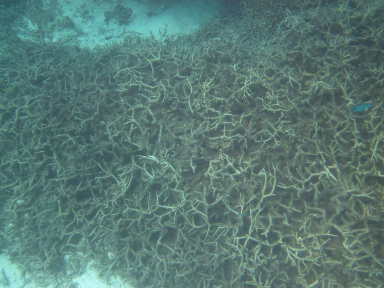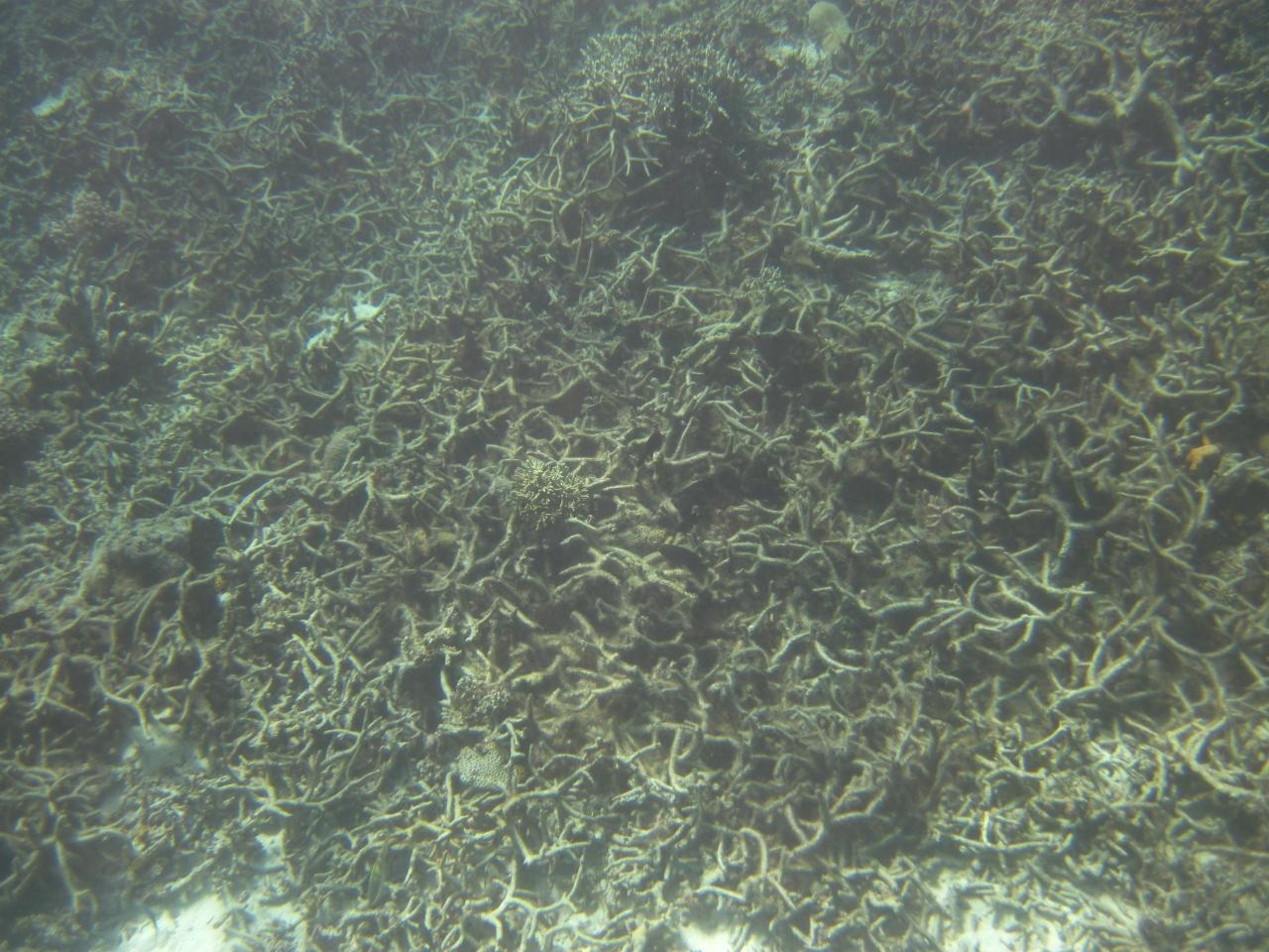以前あった 見事な枝サンゴはみんなこんな風に白化してがれきのように堆積しています -