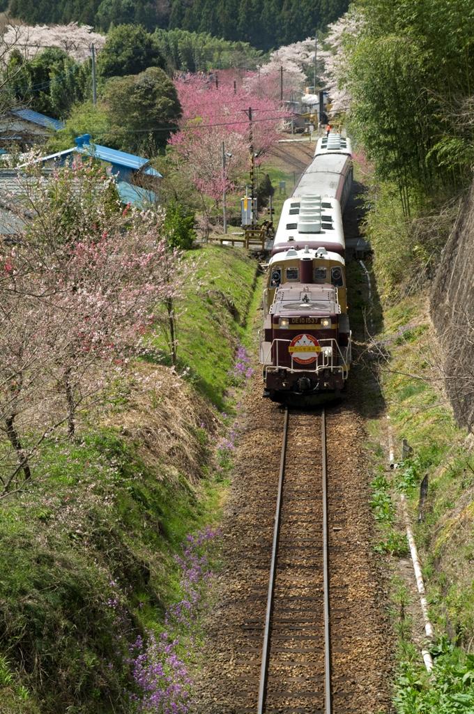 今では珍しい、トロッコです。梅と桃と桜の花が同時に咲いて、とても綺麗ですね。 -