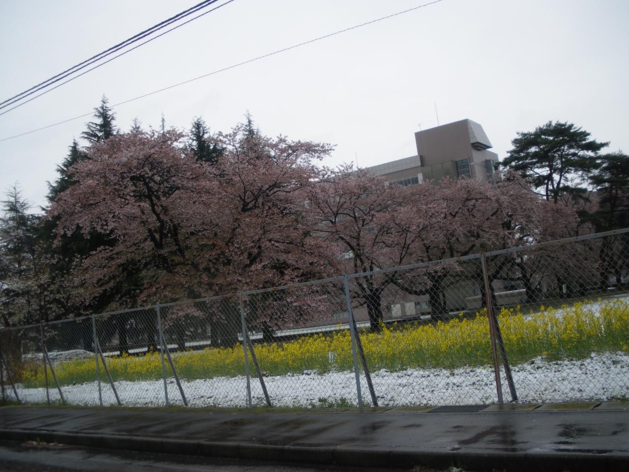 桜のピンク色、菜の花の黄色、雪景色の白色が