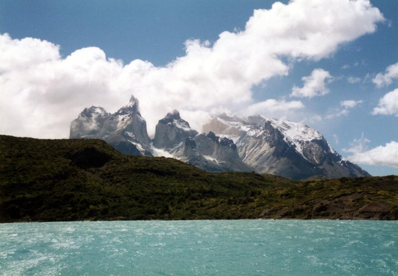 氷河から流れ込む凍えそうなほどの冷水をたたえる湖の向こうには、パイネのシンボル「3連山」が! -
