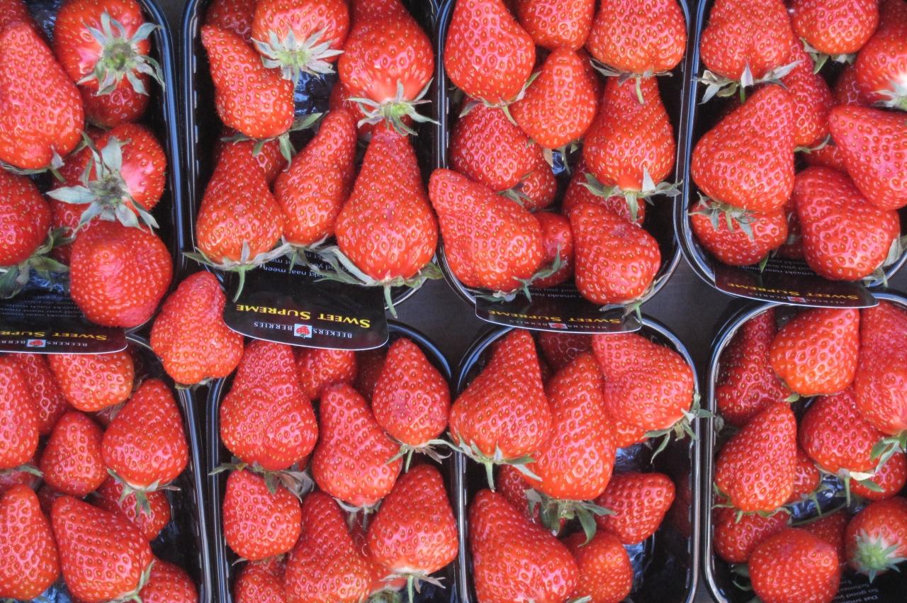 ケースに入った真っ赤なイチゴの光景です。昼食のレストランに近い、果物屋さんの店先で撮影しました。
