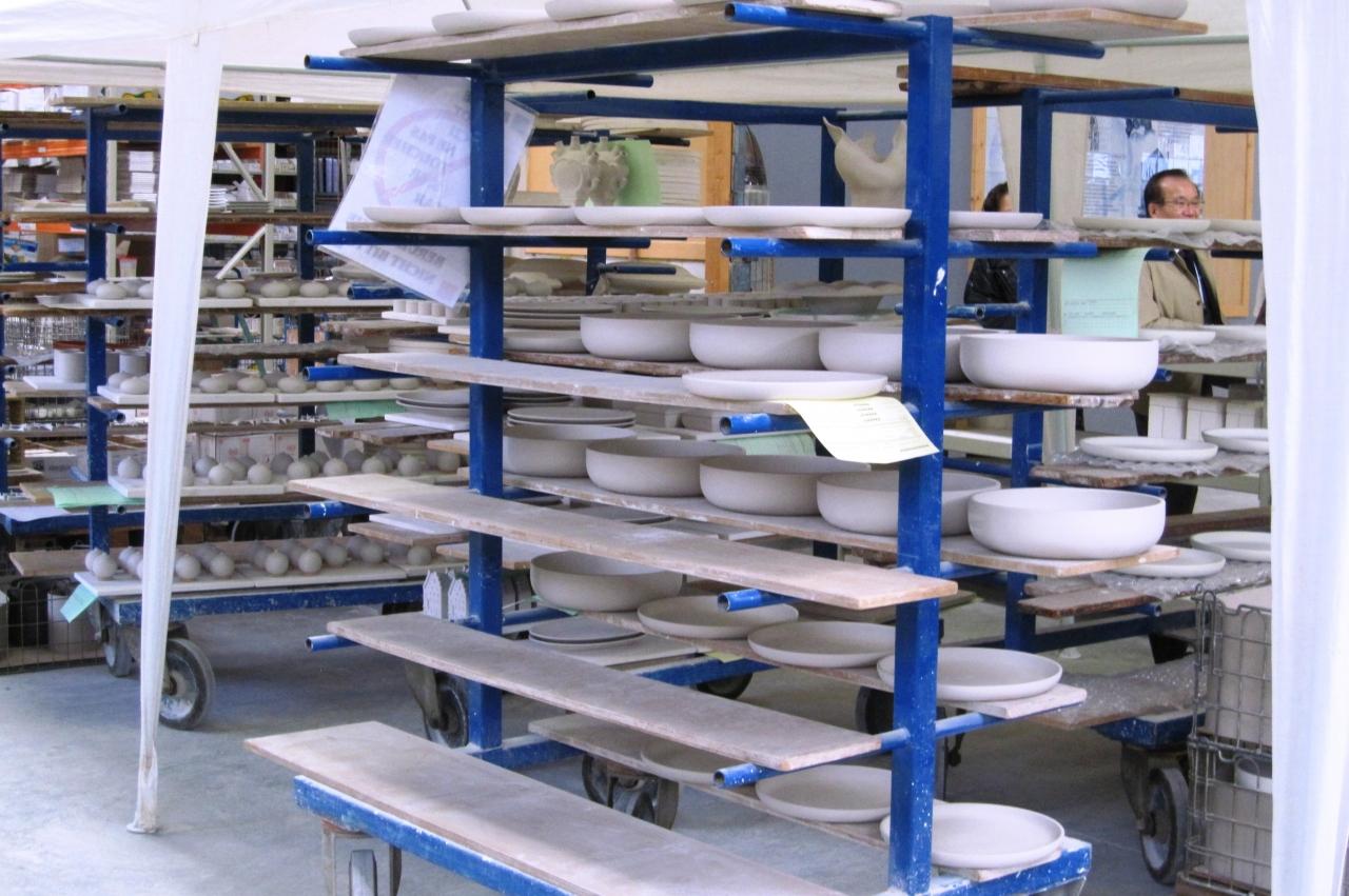 半製品が置かれたタナの光景です。絵付けの前の乾燥工程のように見えました。