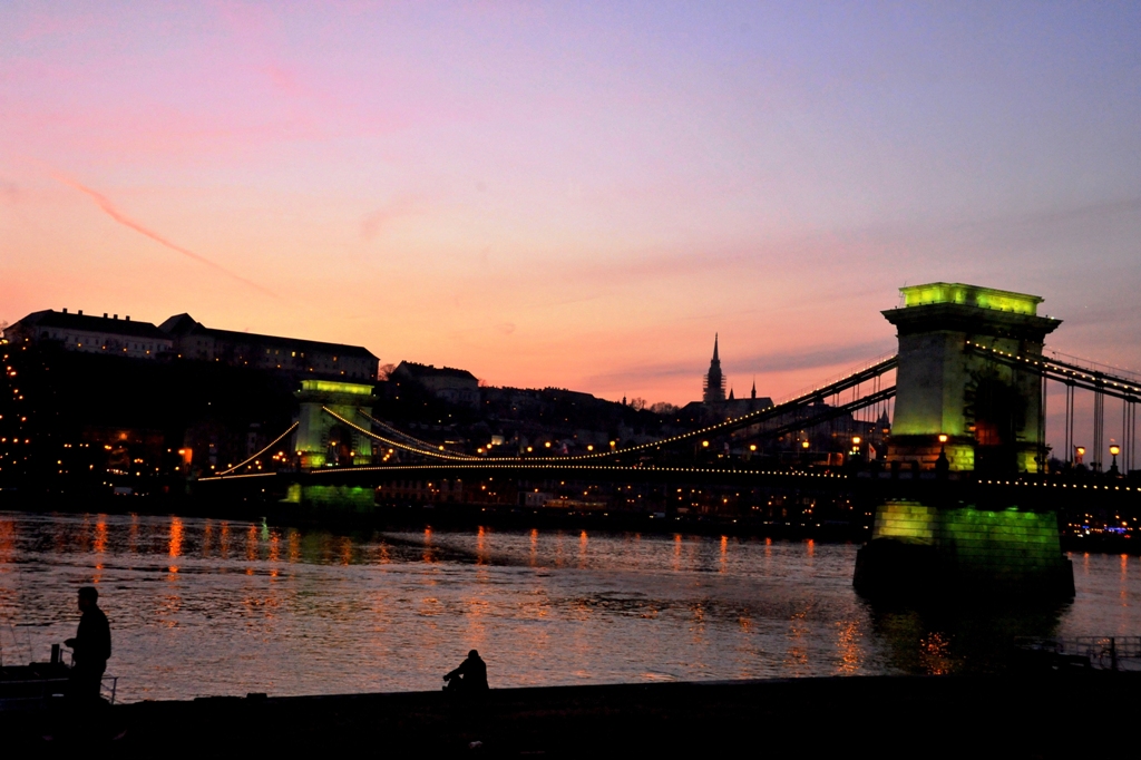 一旦ホテルにチェックイン後、夕食場所の中心部へ向かいます。途中の夕闇が迫るドナウ川、点灯されたくさり橋を車窓から撮りました。