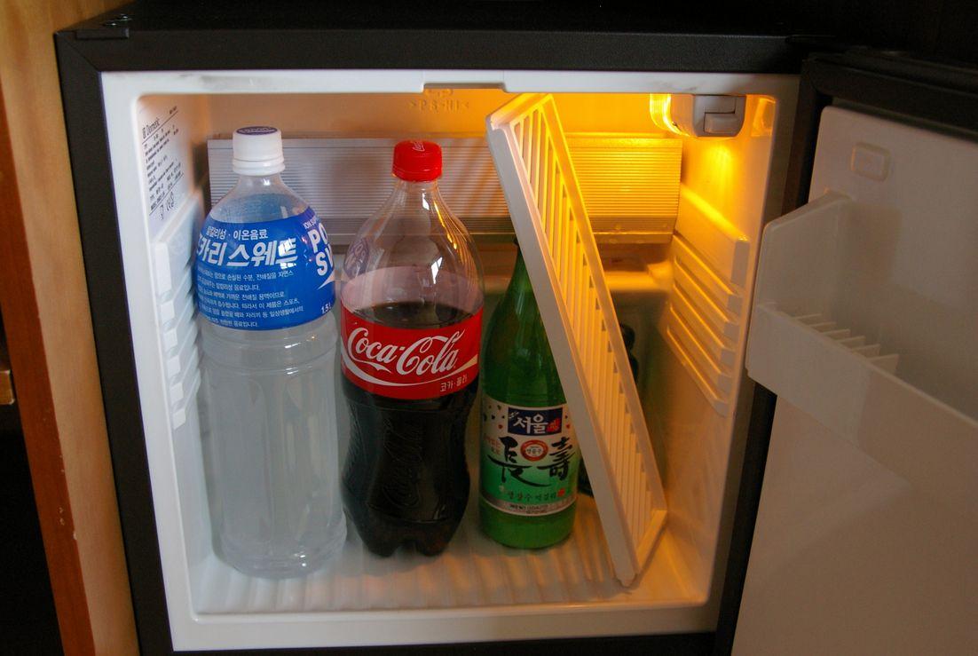 TVラックの下に小さな冷蔵庫があります。
