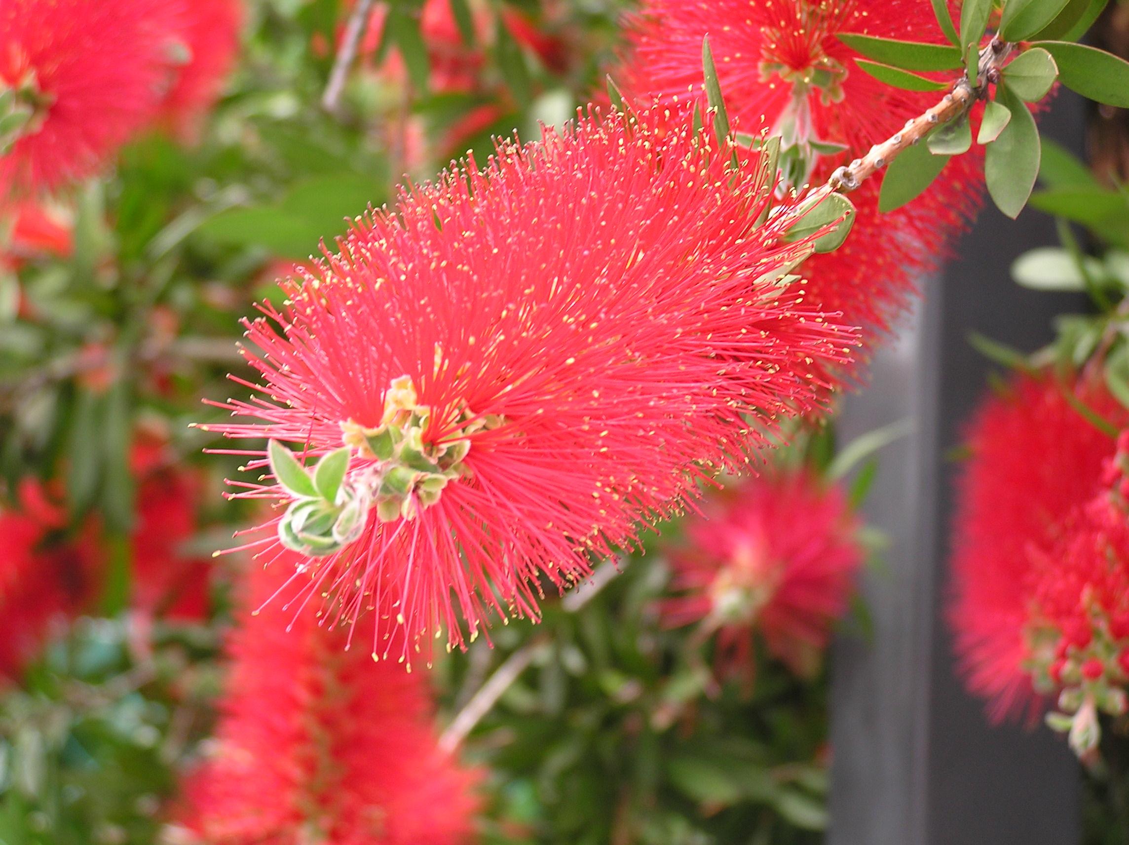 コップ洗いのような形のブラシの木(ブラシノキ)の赤い花。(本郷台駅下辺り)。