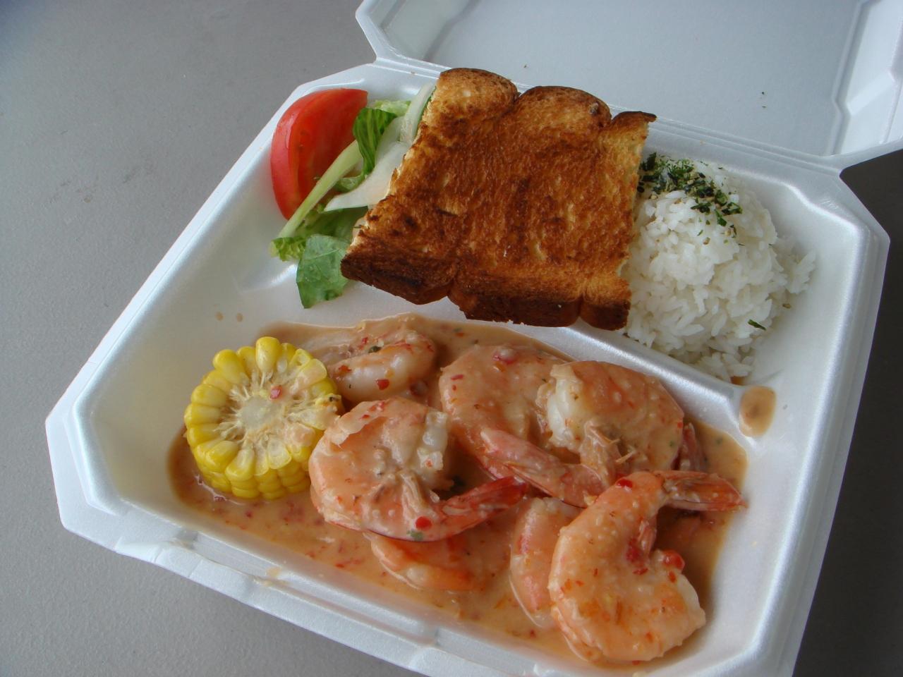 駐車場に2台のバスが止まっており、それぞれのお店でエビ料理をふるまっています。写真はKUHIO Ave.から遠くに位置するお店の、定番'Really Garlic Shrimp'です。梨花さんがテレビで紹介したメニューだそうです。値段は約$13。