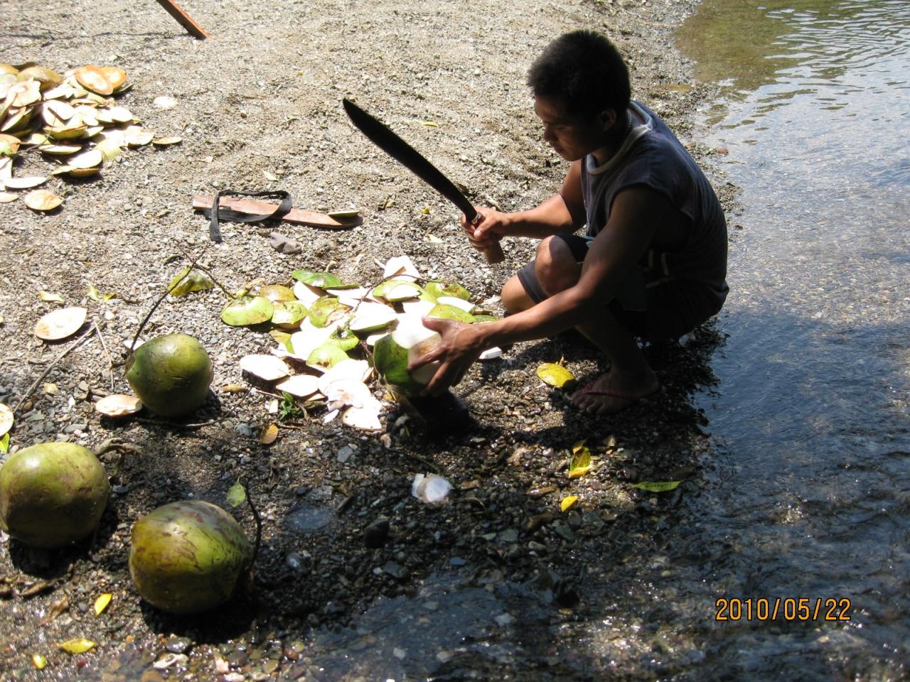 清流で冷やしたココナッツを急いで準備する
