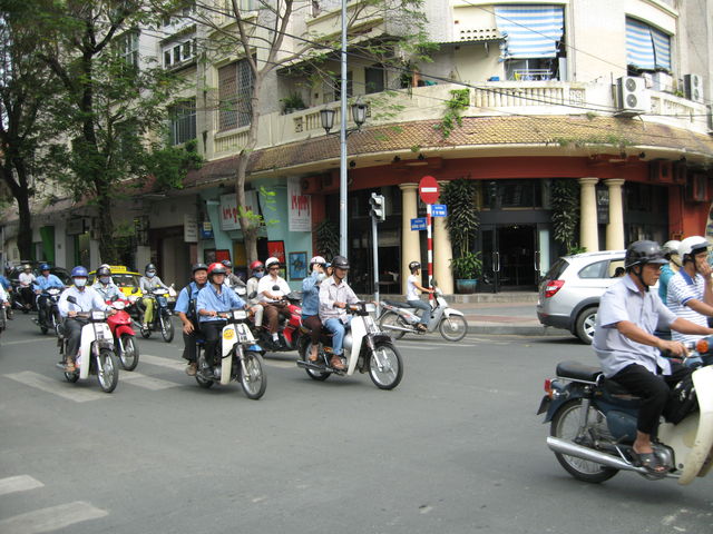 バイクが行き交う大通り 。ほとんど信号が無いので、バイクの間をゆっくり歩いて通り抜けます。