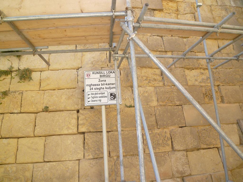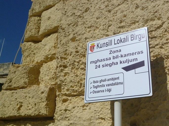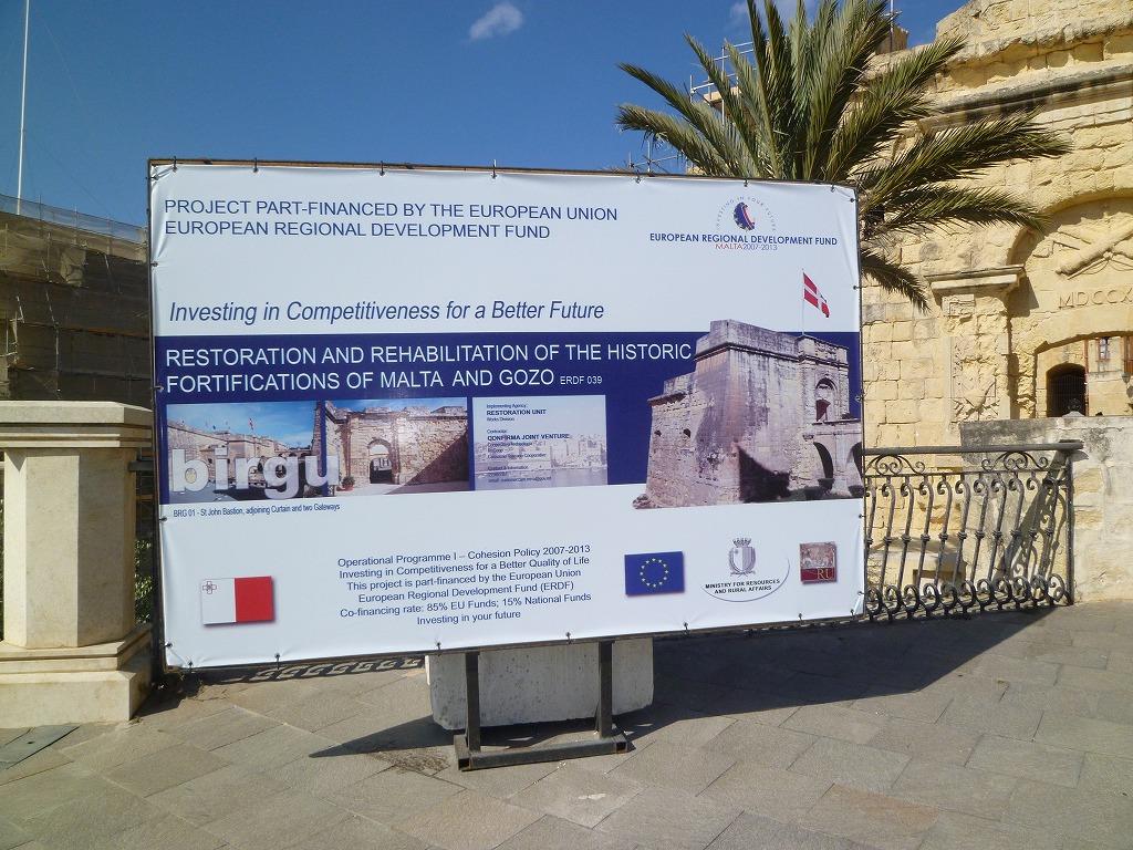 ヴィットリオーザの街並み。EUの基金を使って進めているマルタとゴゾの歴史的要塞の復元と修復についての説明看板。