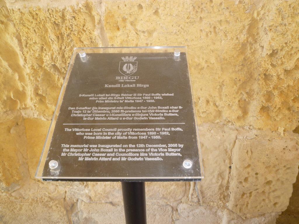 ヴィットリオーザの街並み。マルタ議会で1955−58年、1976−78年の2回議長を務めたNESTU・LAIVIERAの足跡碑文。