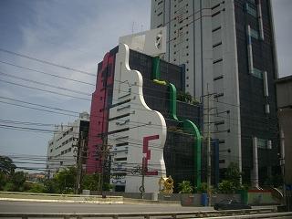 100530-1301.日曜。すぐそこがエカマイ。黒い建物の上部から水が流れてます。涼しいでしょうね。