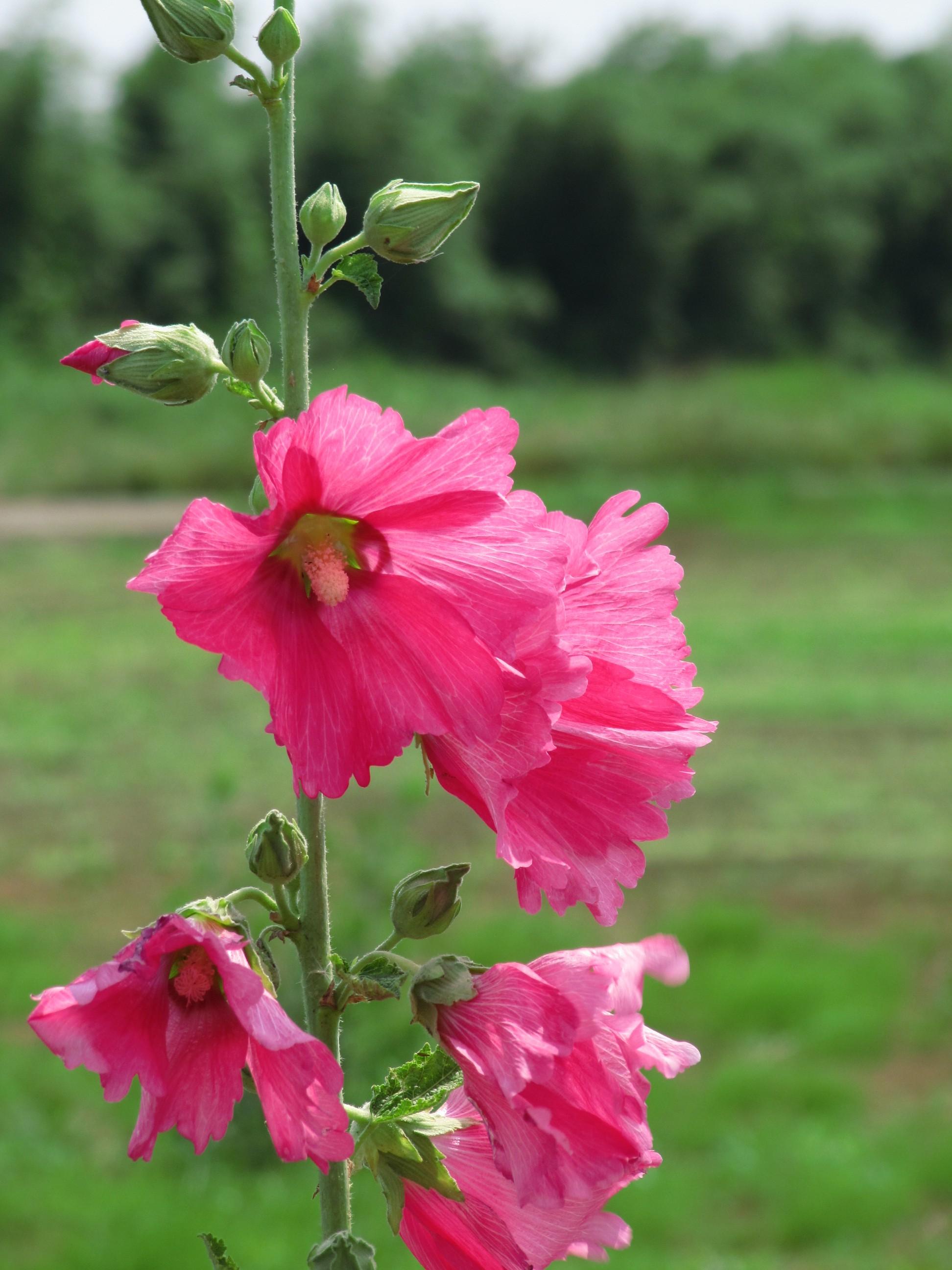 休耕地の緑とタチアオイのショッキングピンク@