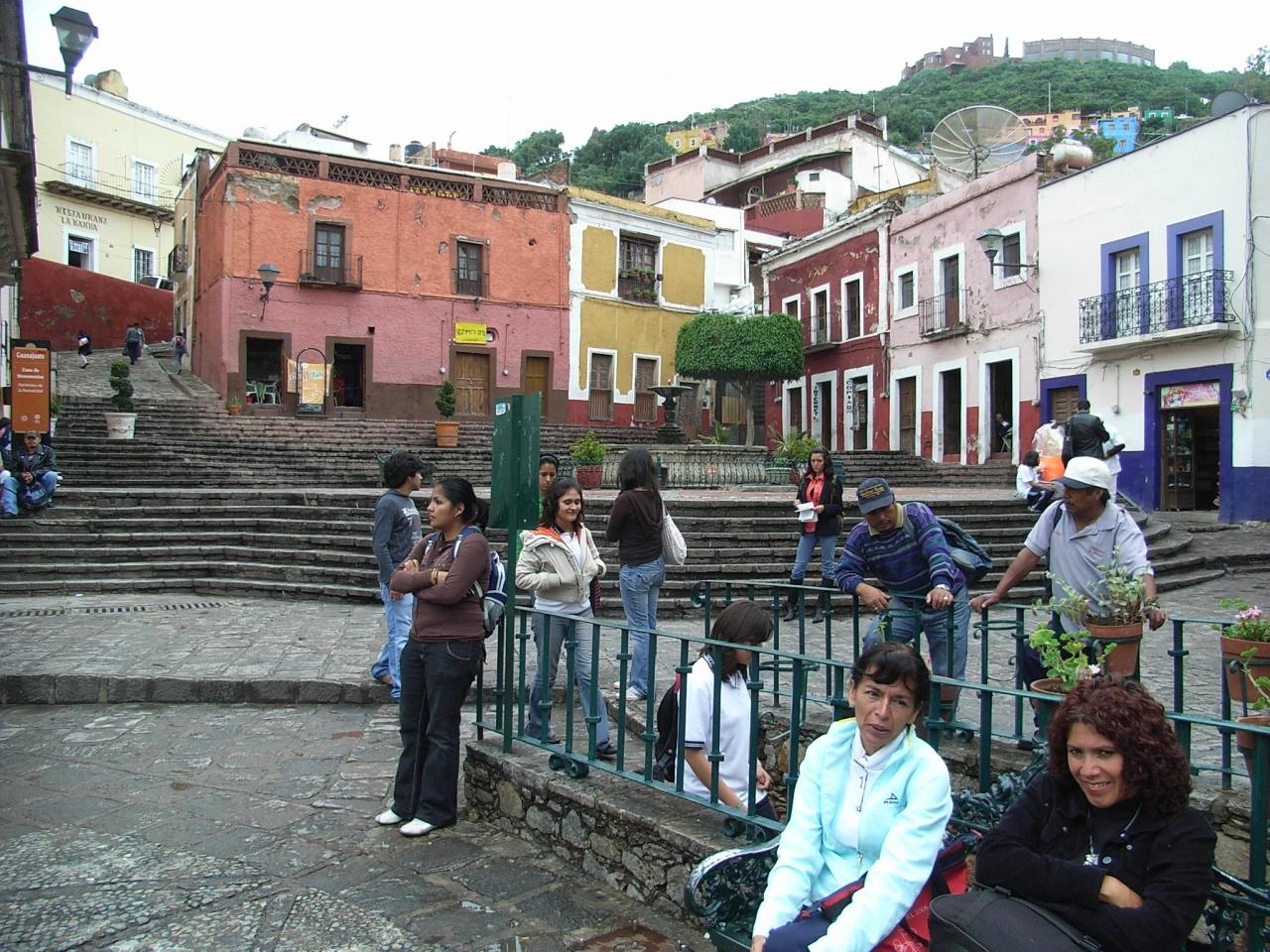 郊外にあるグアナファトバスターミナルからバスで市内に入るとき、かつては地下水路や銀の坑道だったもの利用した地下道に入る。そして、それを抜け出たら車窓からカテドラル(教会)の尖塔のようなものが見えたので、街の中心部に入ったと思い降りたら、それはイダルゴ市場だった。カテドラルではなかったが、市場も中心部の一角であり、ホテルもあったのでさっさとホテルを決め、荷物等を置いて身軽にしてから街歩きを開始した。グアナファトは海抜2,000mの高地にあり、18世紀には世界の約3分の1の銀を産出して繁栄し、教会も博物館も多くあり、植民地時代の美しい街が多くあるメキシコの中でも最も美しい街として知られている。そして街全体が世界遺産に認定されている。赤、緑、黄、青、紫、茶など、主の好みによって家が塗られているのか、街に統一感がなく色とりどりでいかにもラテン民族の賑やかな、楽しんでる感じがして、歩いていてワクワクするような街だった。