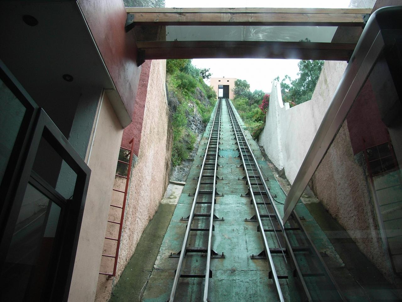 上から街を見るためケーブルカー乗り場にきた。上を見るとほぼ垂直に近い。